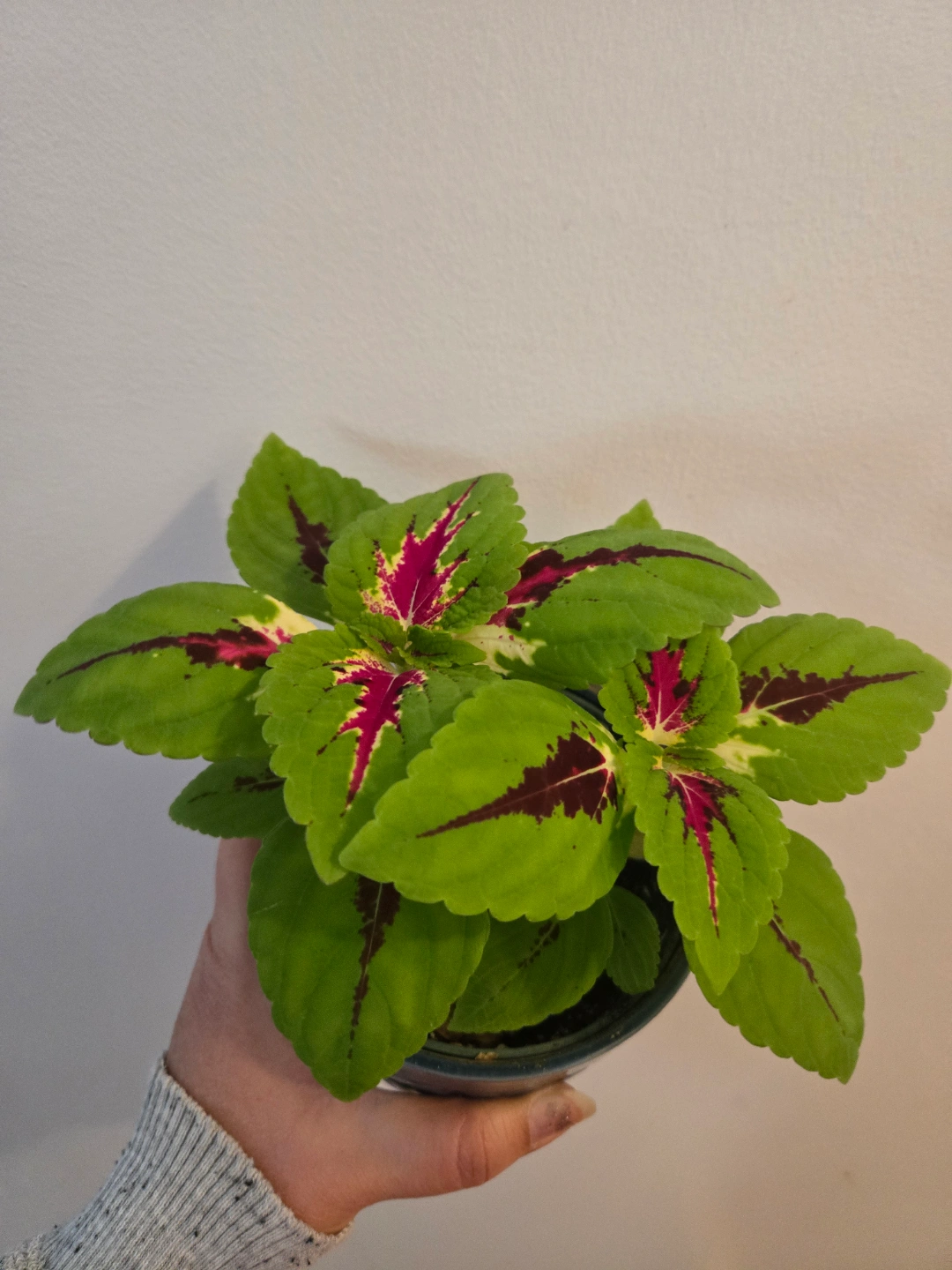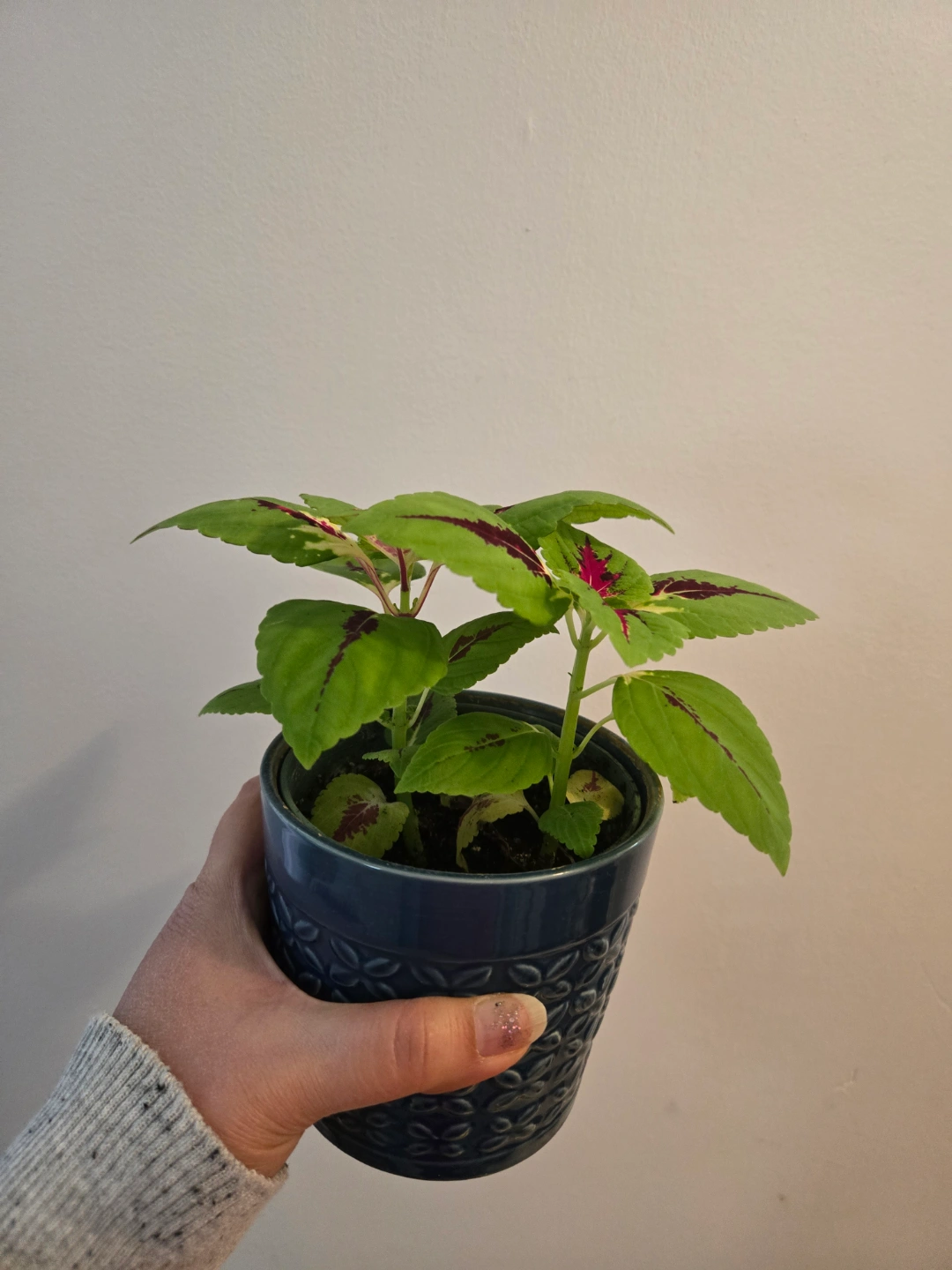 Healthy Coleus plant. Bright green leaves with maroon accents. Planted in a dark blue ceramic pot. Small size, perfect for a desk or windowsill.
