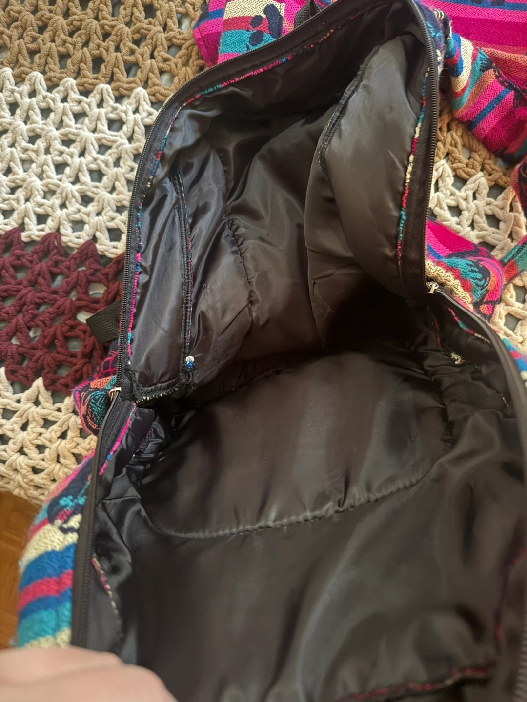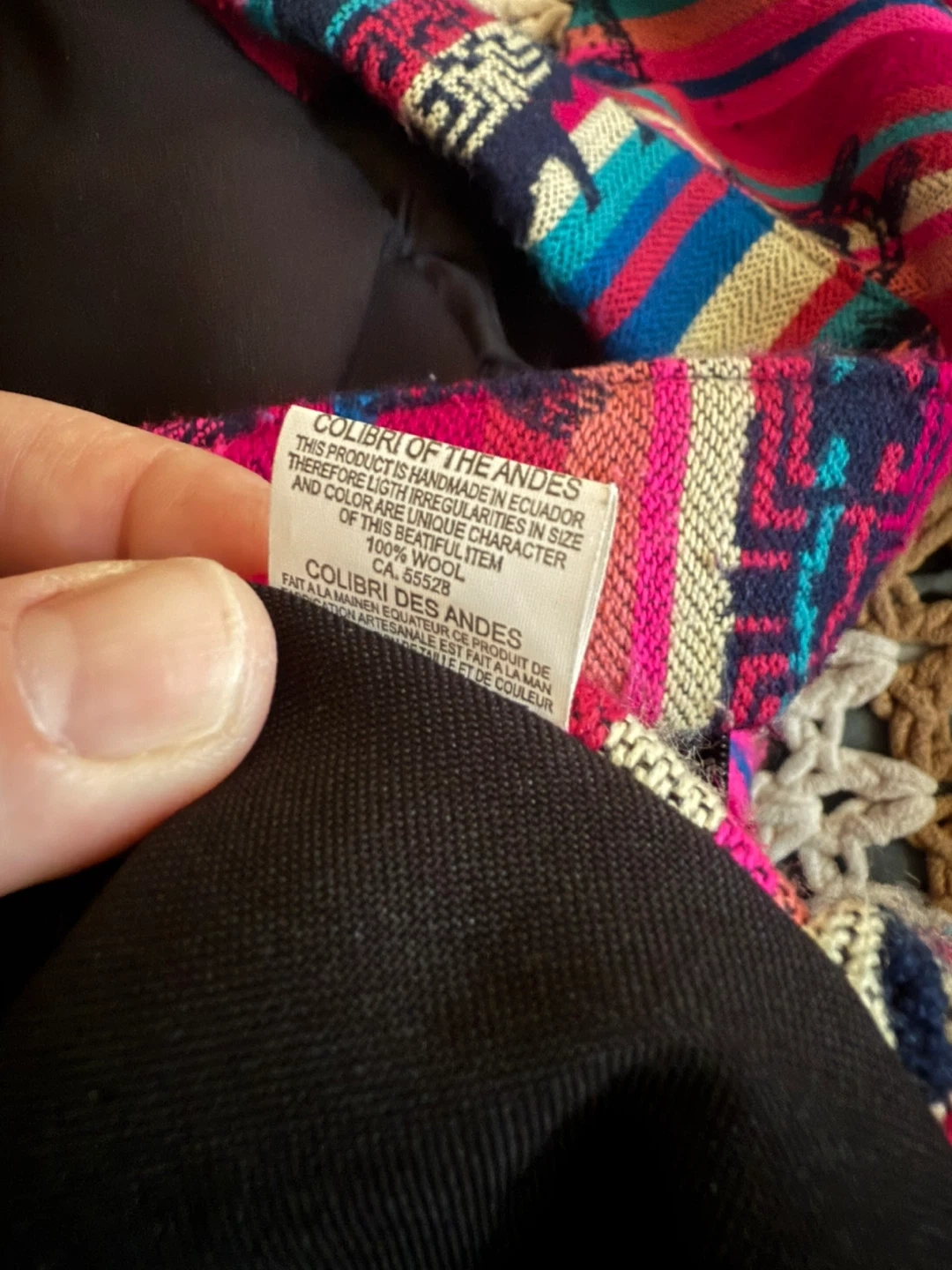 This is a Colibri of the Andes backpack, handmade in Ecuador. It features a colourful striped pattern with animal designs. The exterior is made of 100% wool. The interior is black.