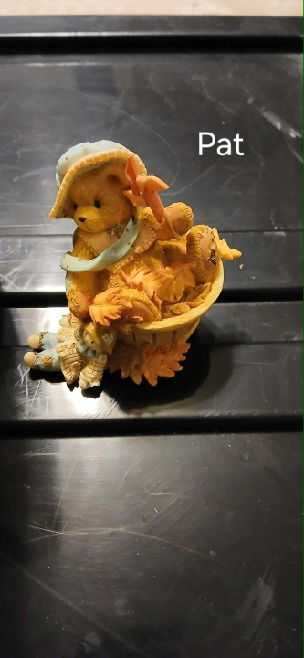 This is a very cute teddy bear figurine, perfect for collectors or as a charming decorative piece for your home! The teddy bear is wearing a hat and is surrounded by autumn leaves, adding a touch of seasonal charm