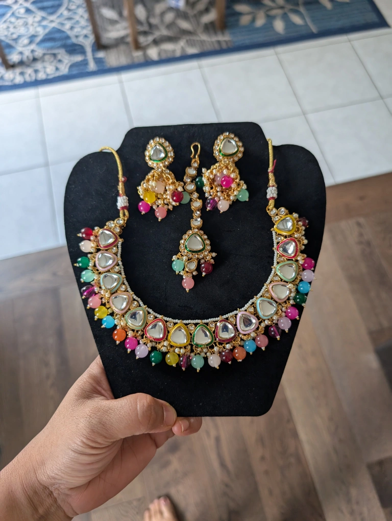 Beautiful kundan necklace set with matching earrings and maang tikka. The necklace features colourful beads and stones. Perfect for weddings or special occasions!