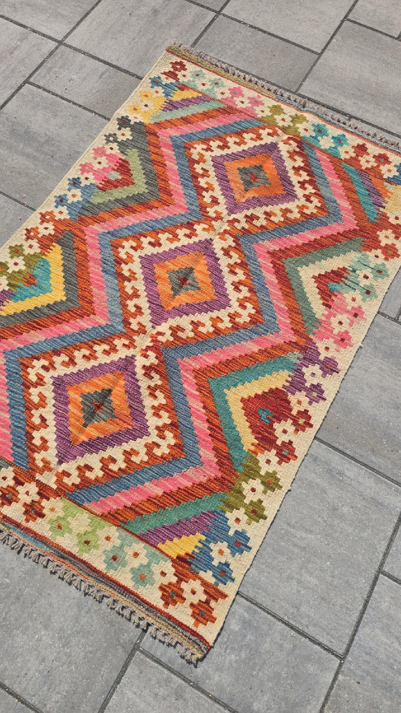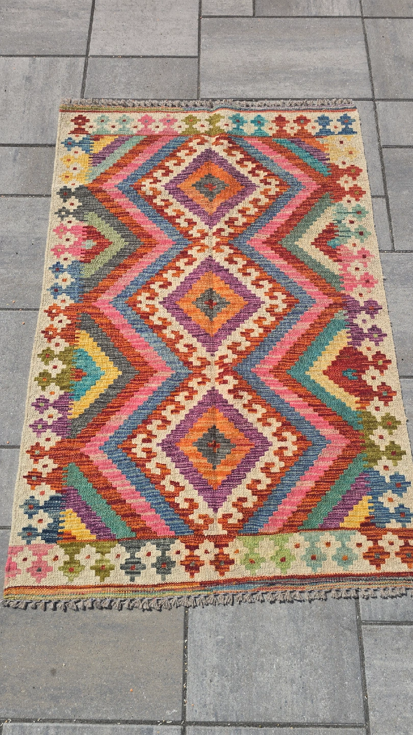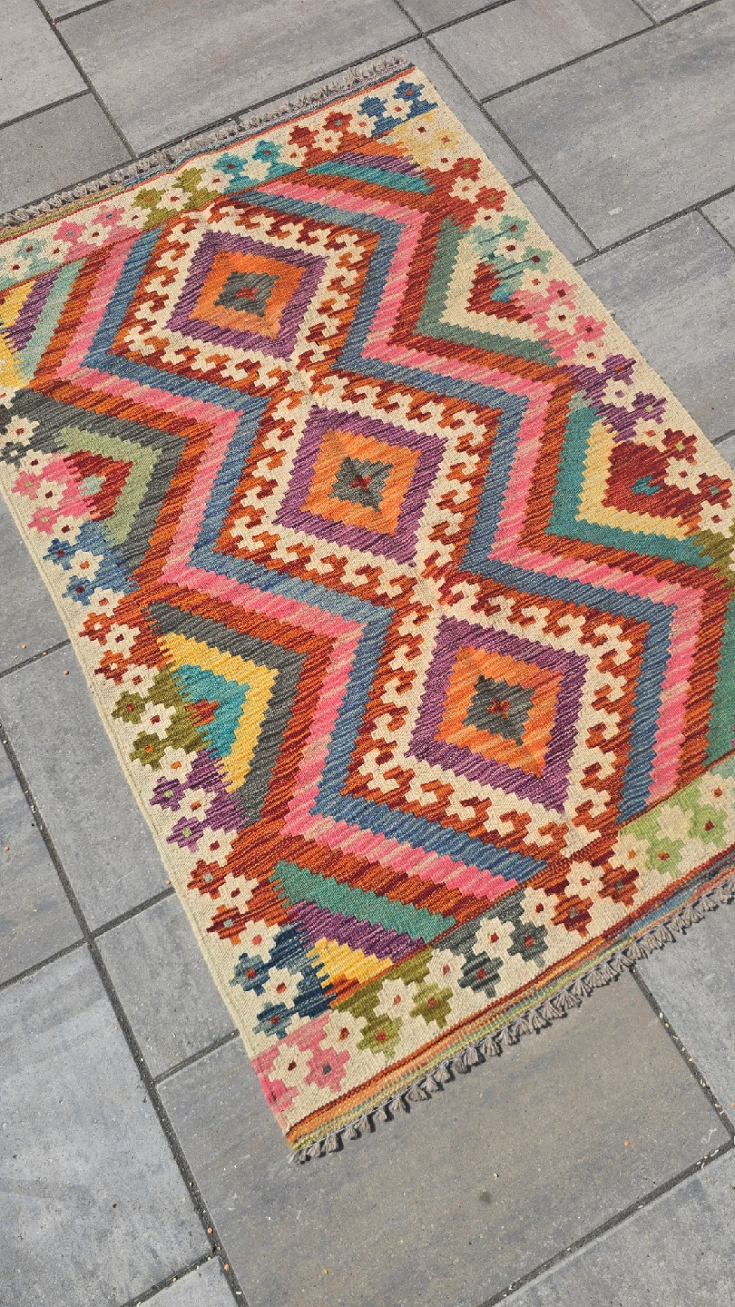 This area rug features a vibrant and colourful diamond pattern. It would be a great addition to any room!