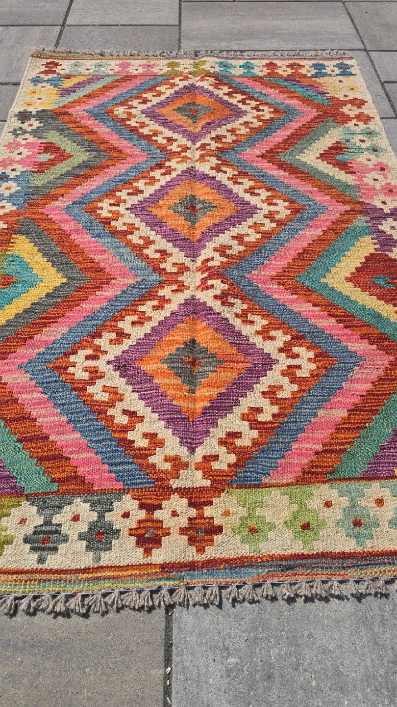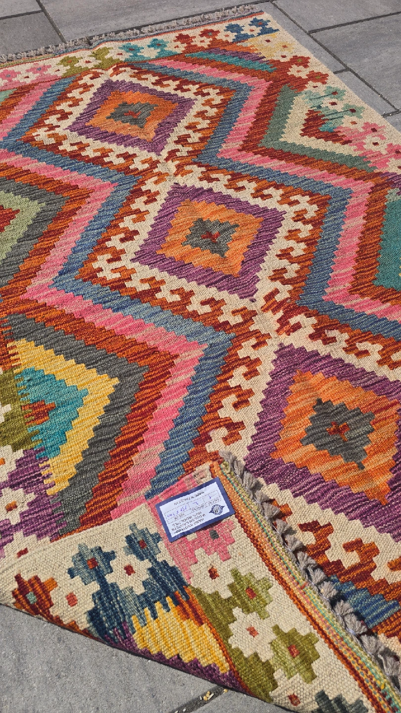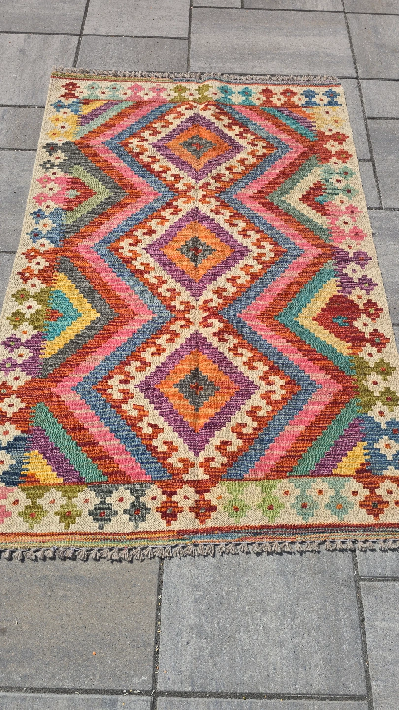 This area rug features a vibrant and colourful diamond pattern. It would be a great addition to any room!