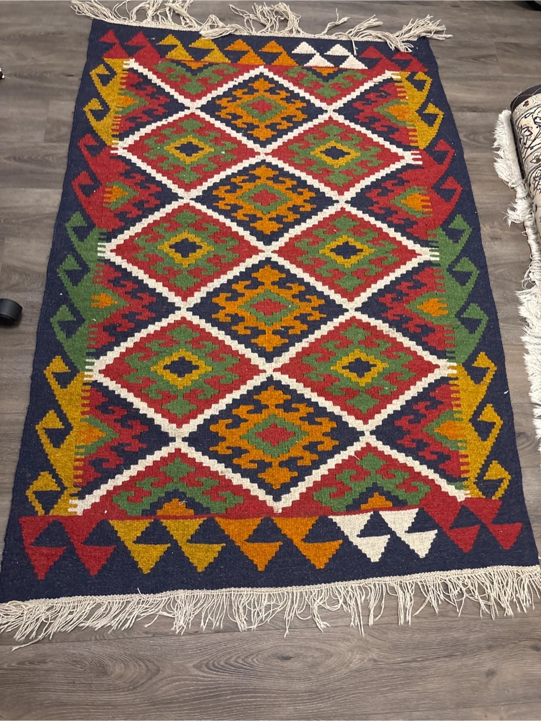 This is a colourful persian rug with a diamond pattern. It has a dark blue border with red, green, yellow and orange accents. The rug also has white tassels on the ends. It would be a great addition to any room!