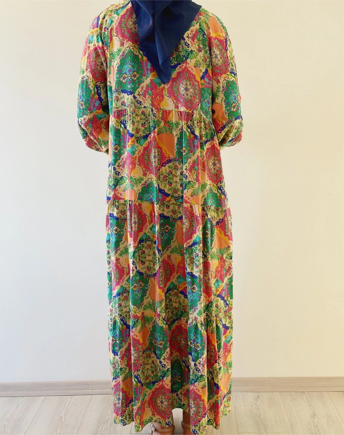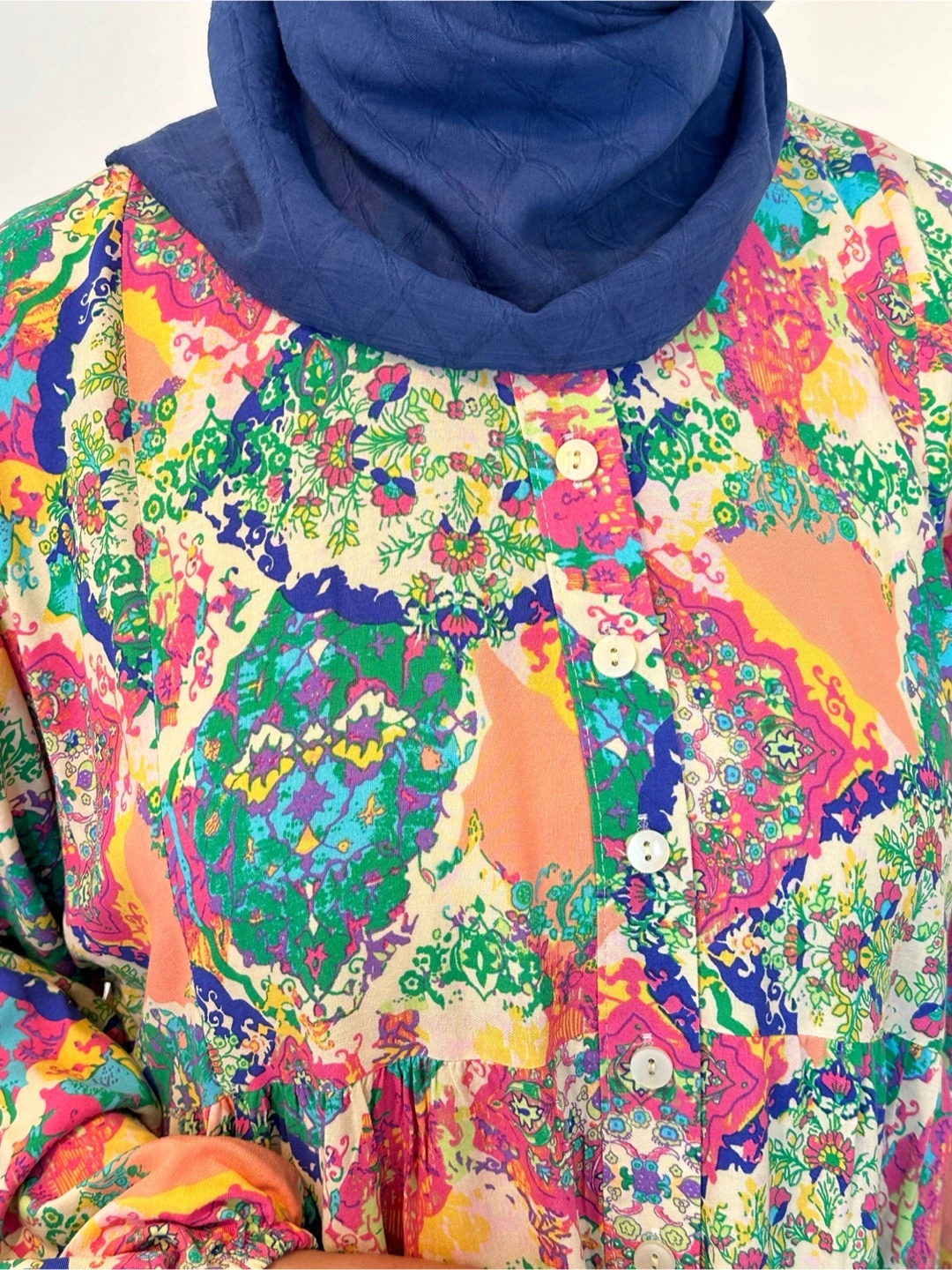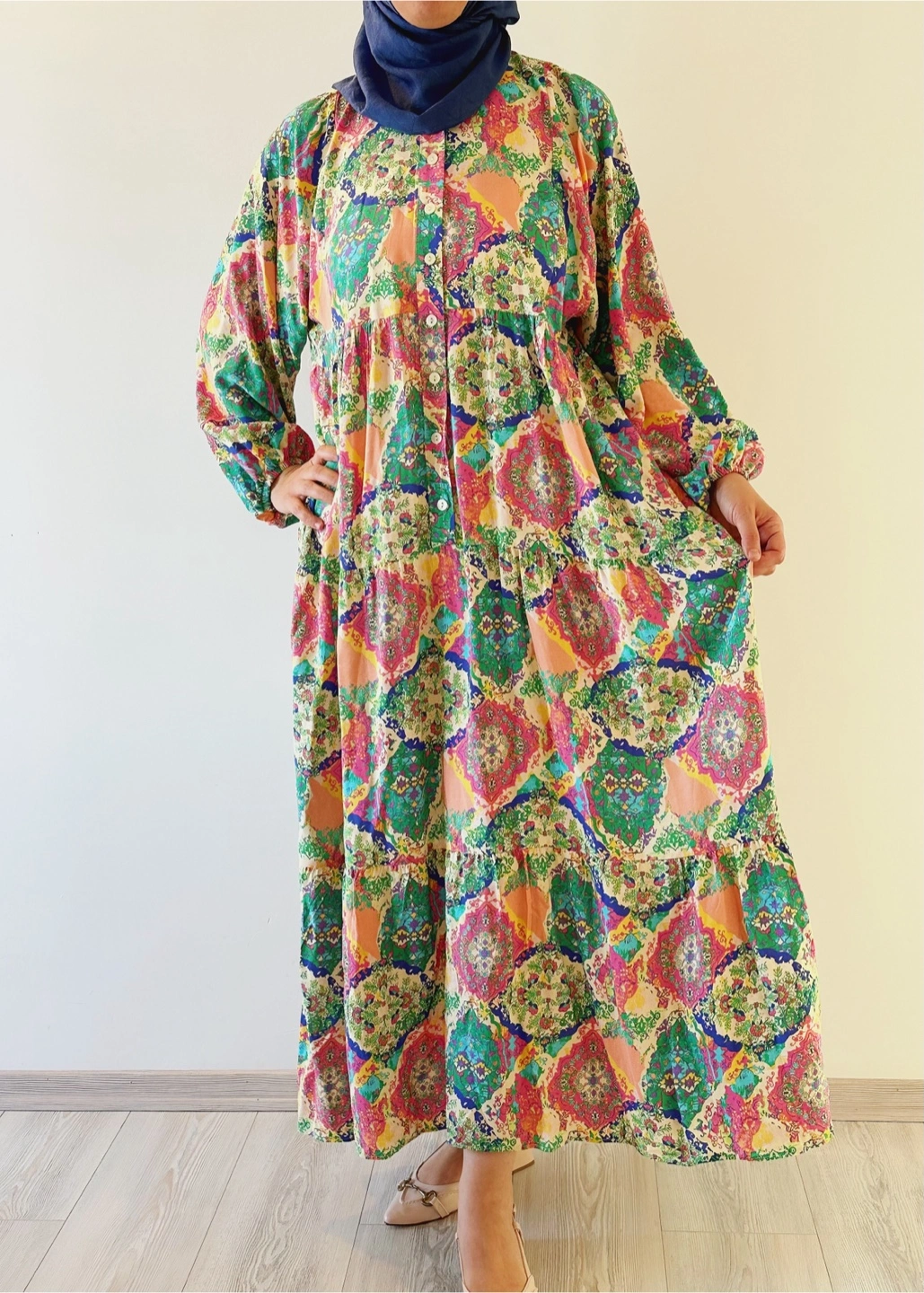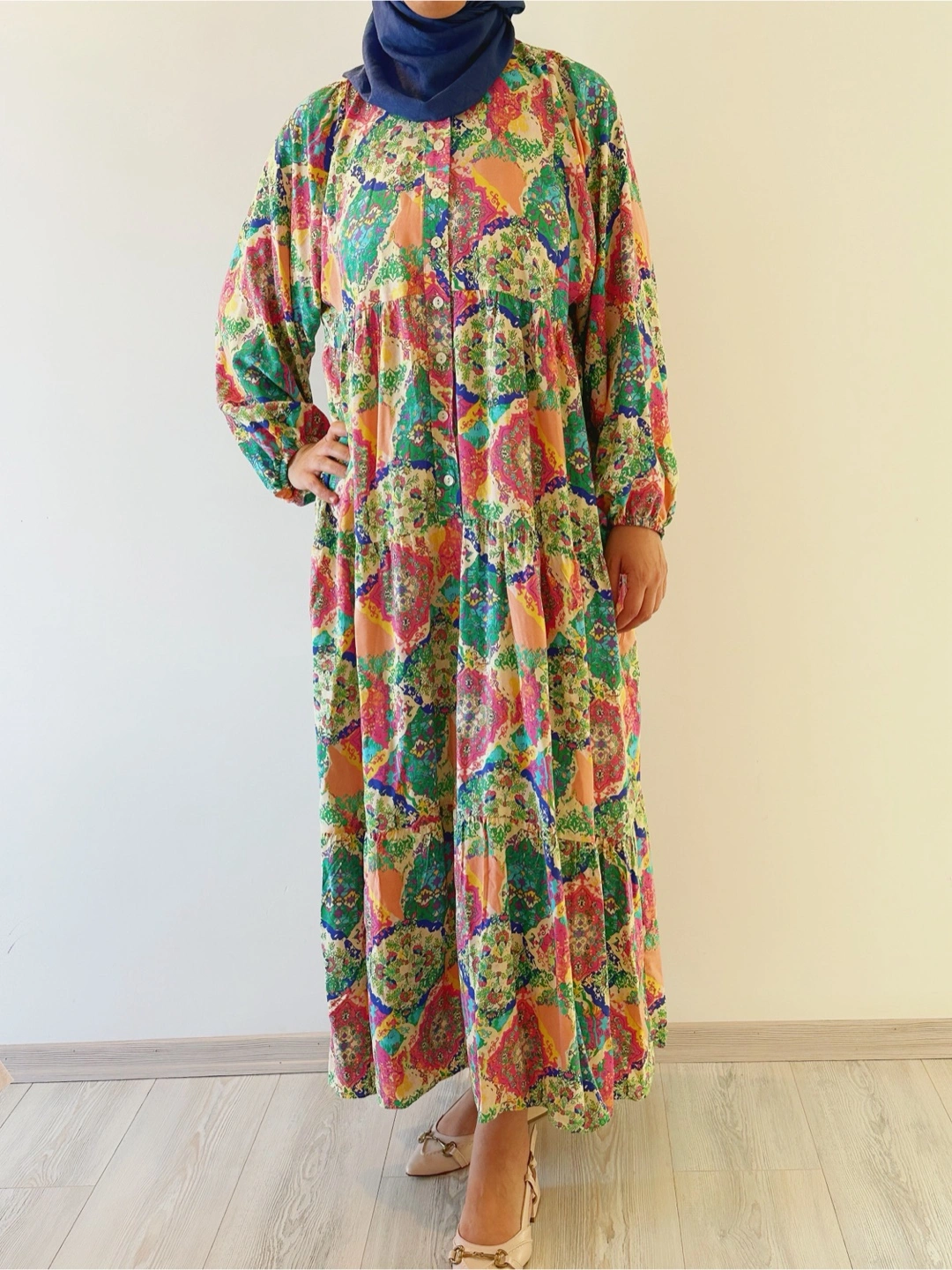 This is a colourful, patterned maxi dress. It features a button-up front and long sleeves. Perfect for adding a vibrant touch to your wardrobe!
