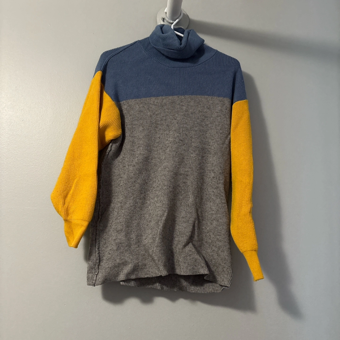 Selling a cozy colour block turtleneck sweater! It features a blue turtleneck, grey body, and yellow sleeves. Perfect for staying warm and stylish during the cooler months