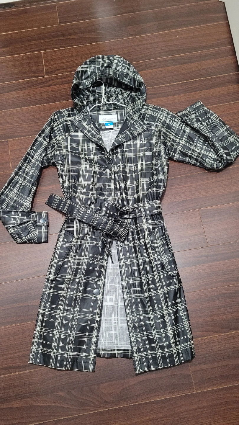Columbia rain jacket in a black and white plaid pattern. It has a hood and a belt, perfect for staying dry on rainy days!