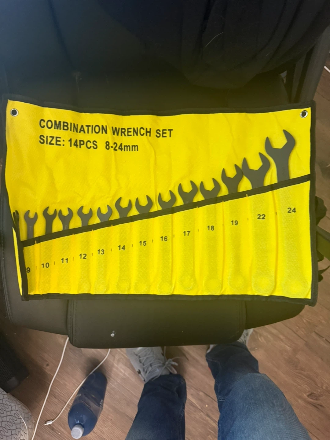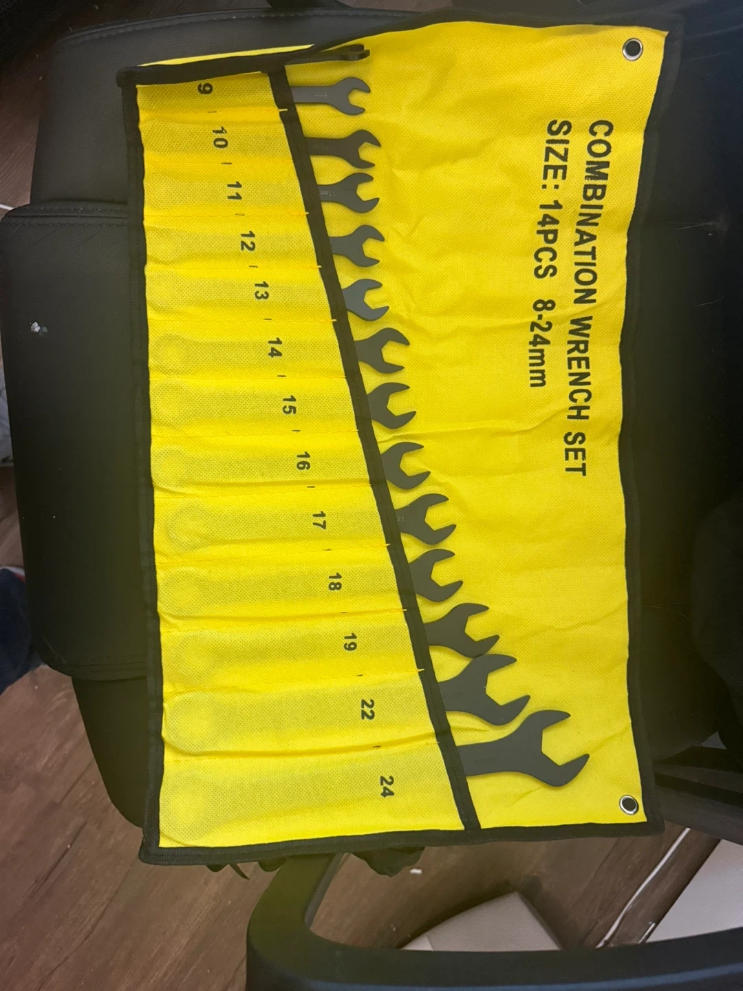 Selling a combination wrench set that includes 14 pieces, ranging in size from 8 to 24mm! It comes in a handy yellow and black roll-up case for easy storage and organization