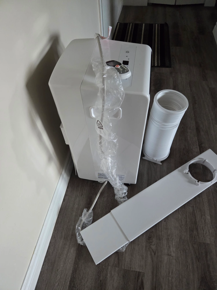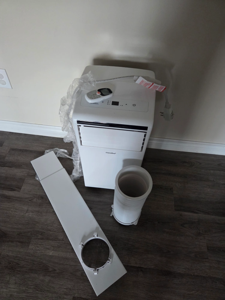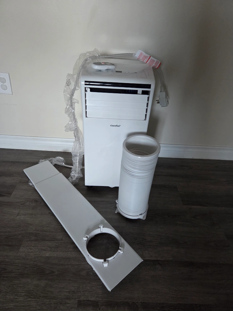 Selling a Comfee portable air conditioner in white. It comes with all the components you see in the pictures, including the hose and window kit. Perfect for cooling down a room quickly!
