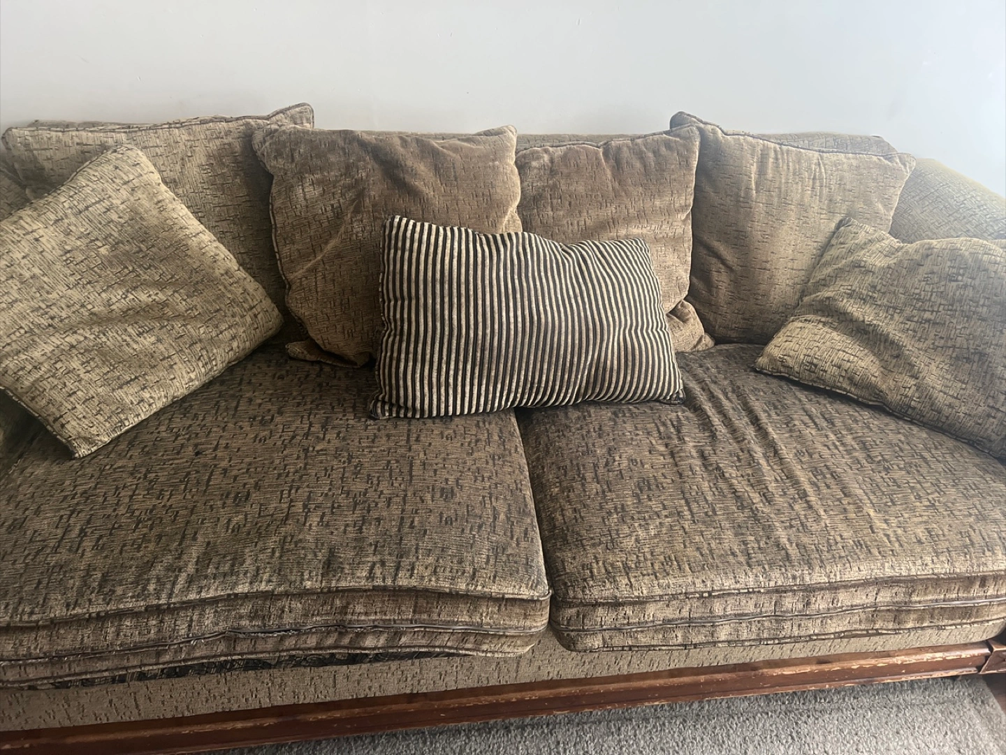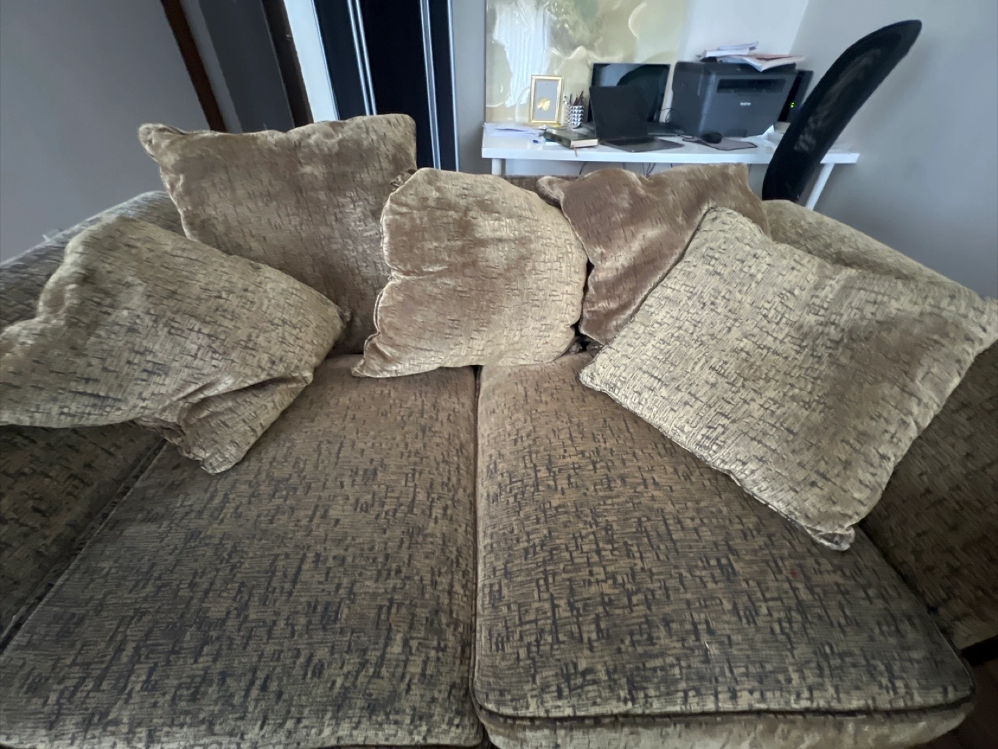 Selling a comfy brown sofa that's perfect for lounging! It comes with a bunch of pillows to make it extra cozy. It's in good condition and ready for a new home. Great for a living room or den