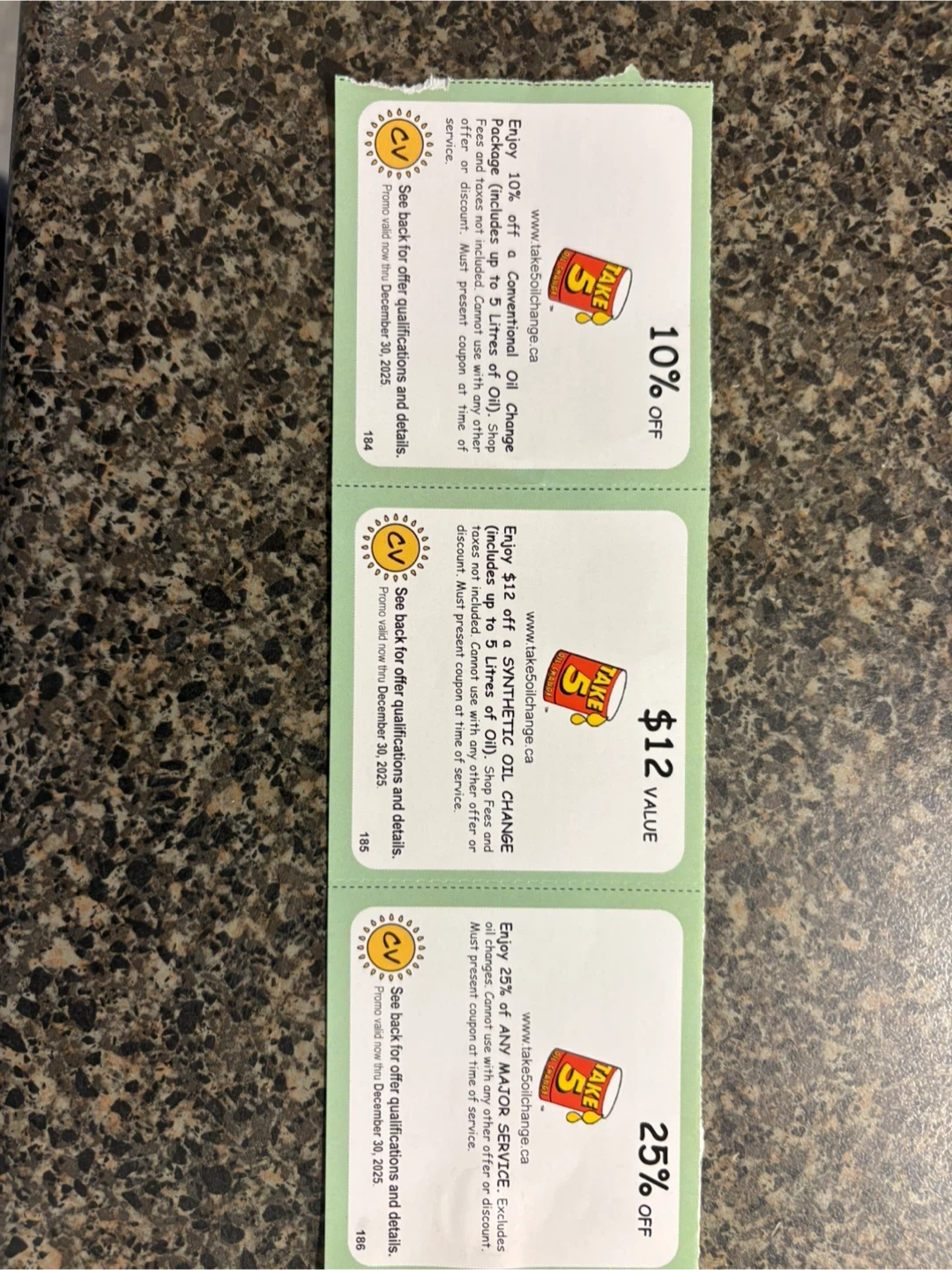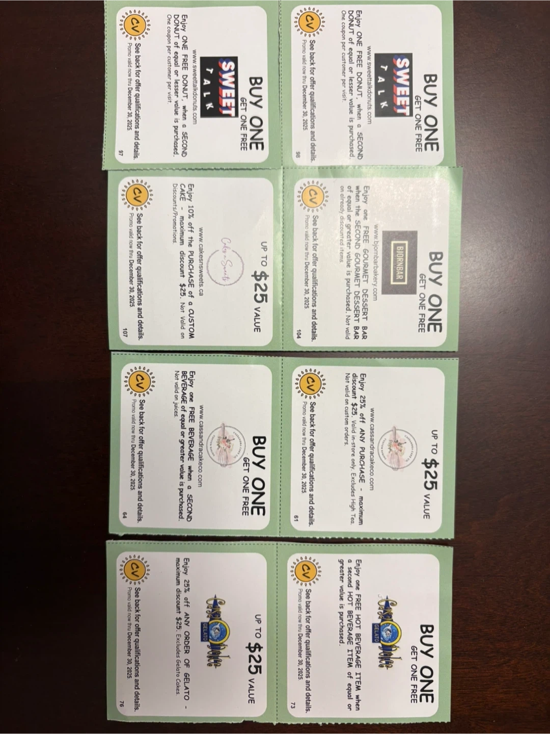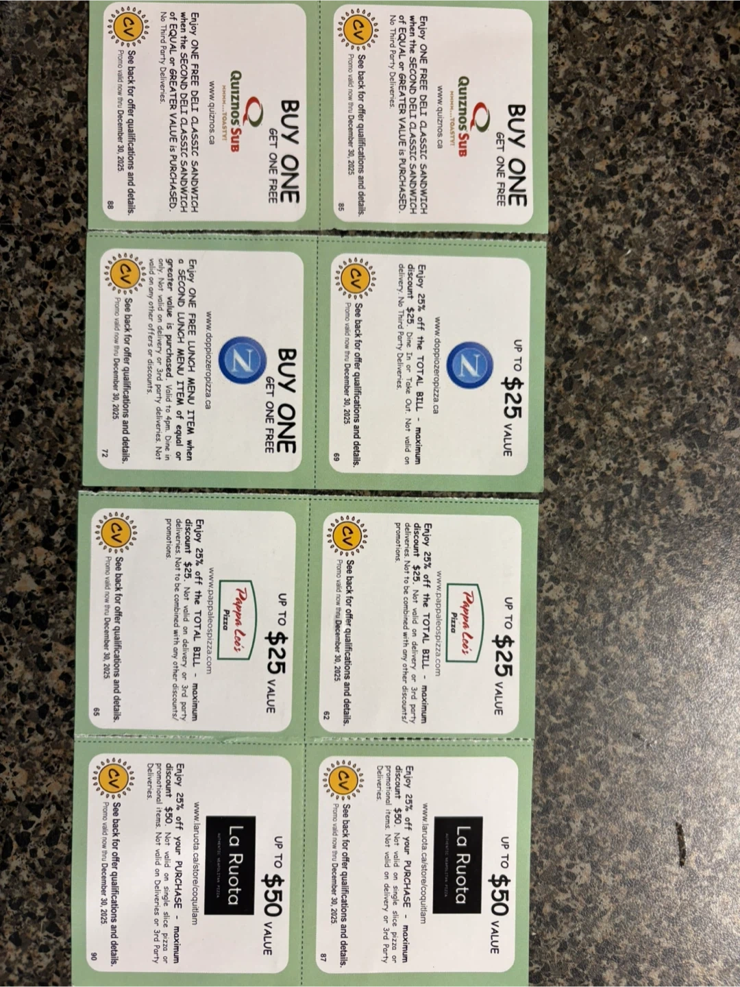 Giving away a variety of coupons for different stores and services! La Ruota Pizza Doppio Zero Pizza Papa Leo’s Pizza Quiznos Sub Spacca Napoli pizzeria St James Well pub Taps & Tacos Cat and Fiddle pub Fat Burger The Chopped Leaf Pita Pan donair Grelhados restaurant Cassandra Cake company Casa dolce gelato Sweet Talk Bjorn bar bakery Cakes n Sweets bakery Pharmasave Supplement King Take 5 Oil Change Tan de Soleil All coupons are for Coquitlam, Port Coquitlam, and Port Moody. All valid until December 30, 2025.