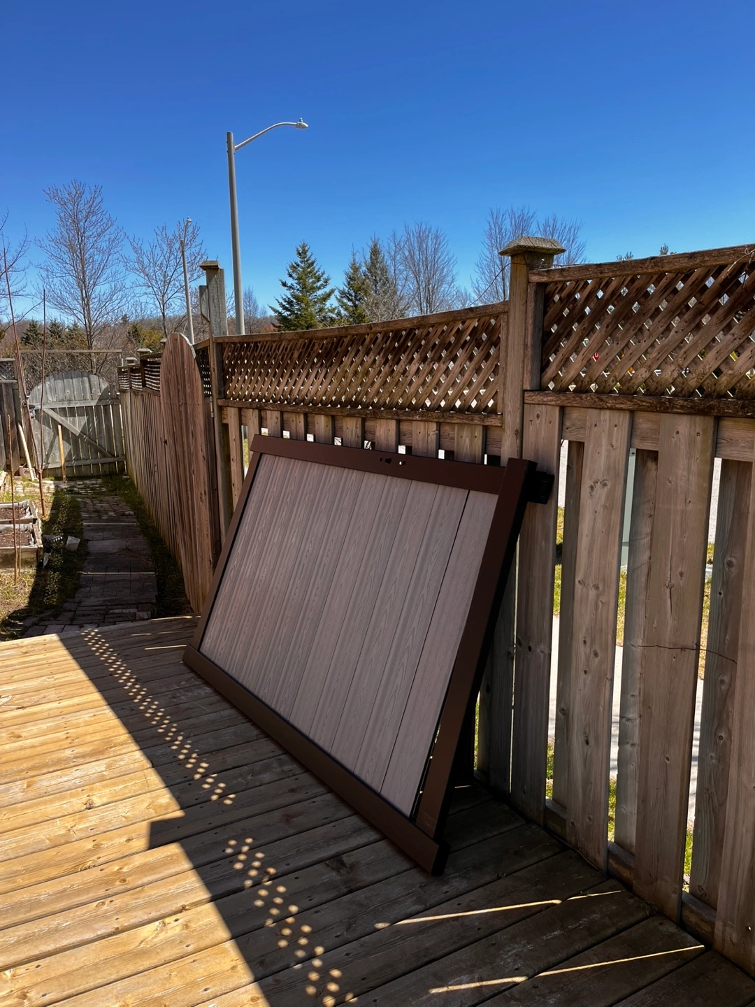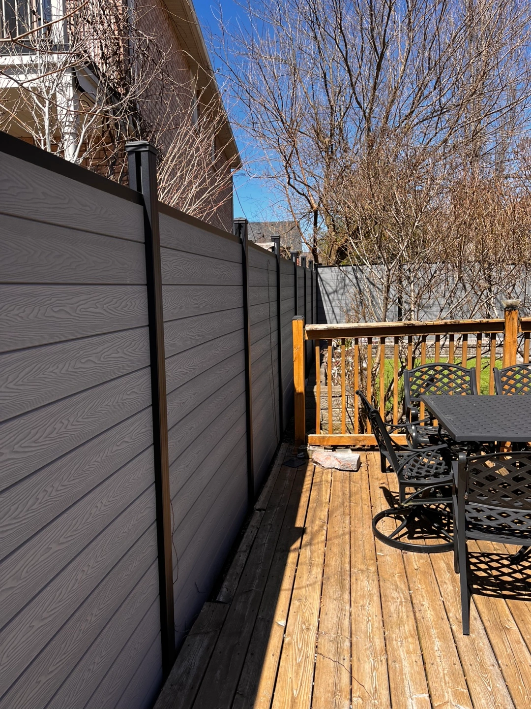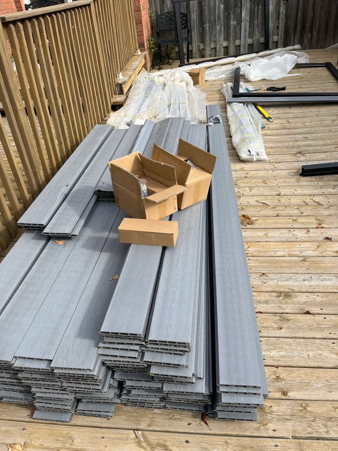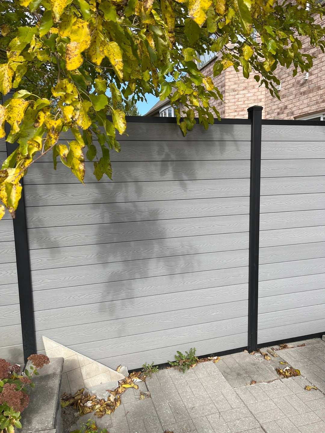 Grey composite fence panels. 2 doors ,Includes posts and hardware. The posts and doors frame are made of aluminum alloy ,Unused, new in box. Total for 25 meters long 1.8 meters high fence.