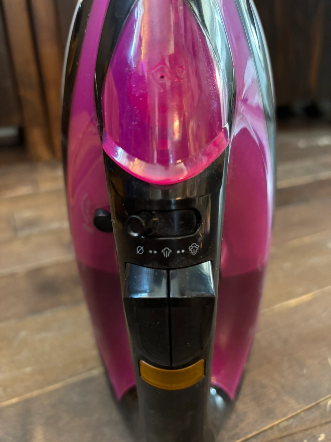 Purple and black iron. Features variable steam settings and auto-off function. Only used a few times