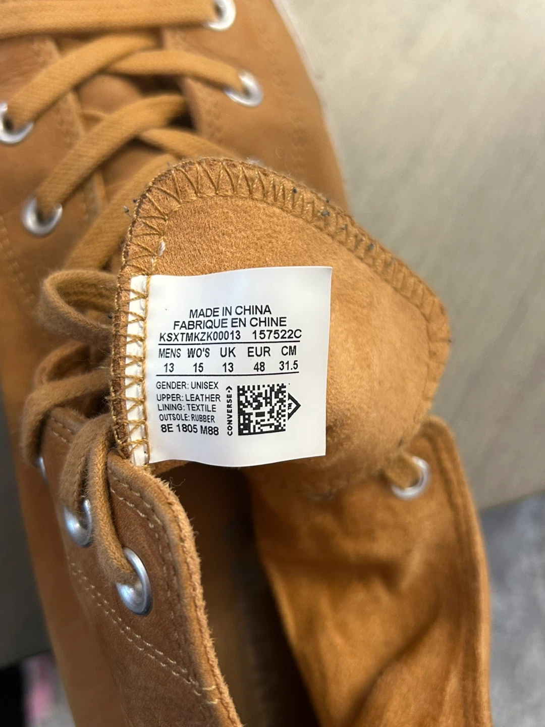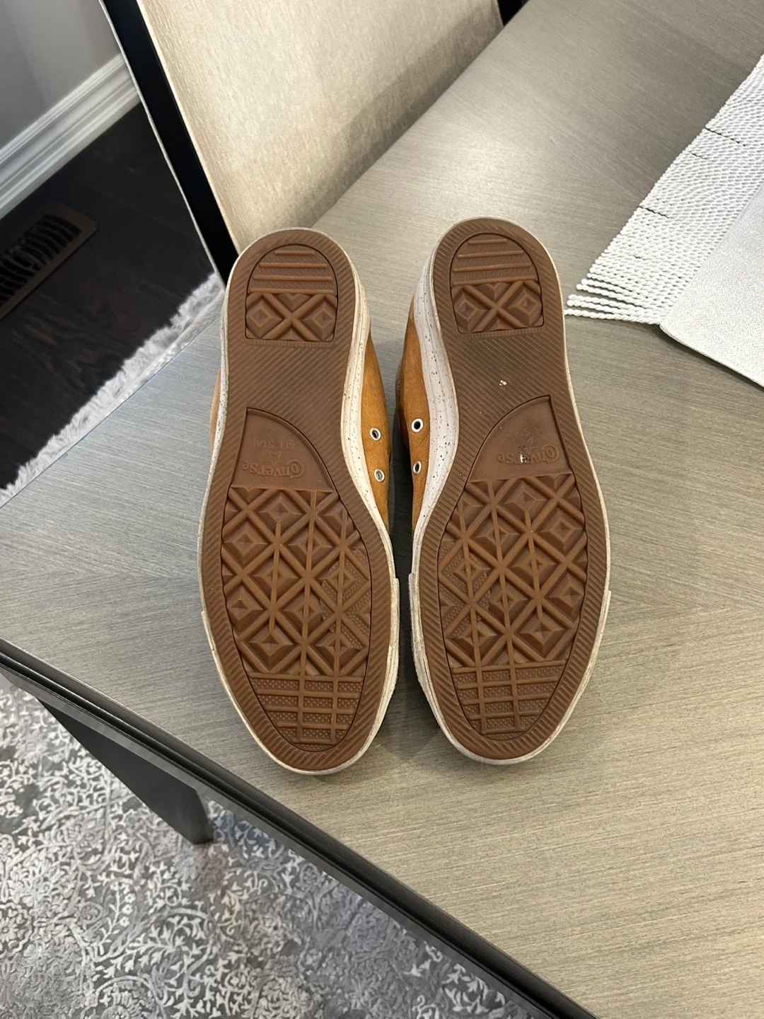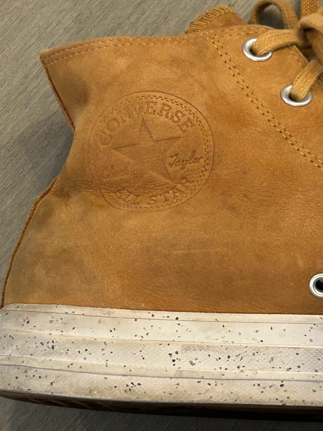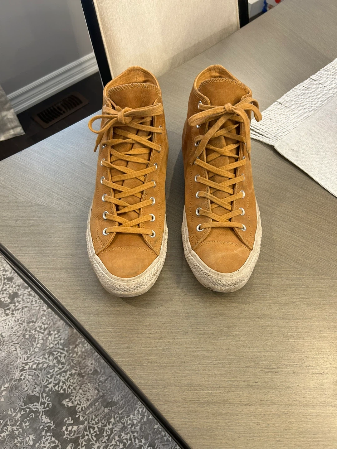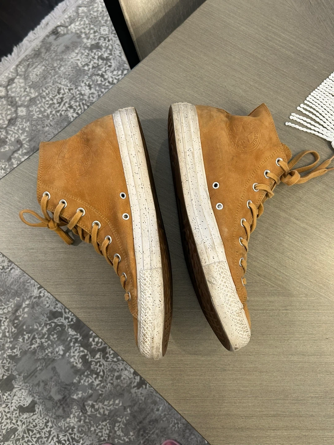 Converse (Unisex) Chuck Taylor All Star high tops in a tan/brown colour. They're in great condition! The size is US men's 13. Women’s size is 15. These have a soft leather upper and rubber outsole.
