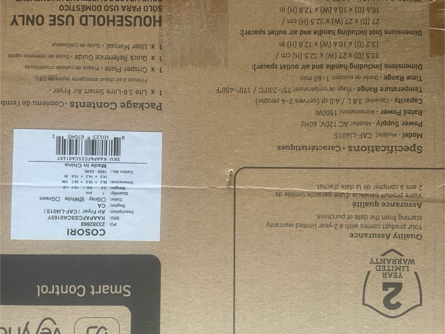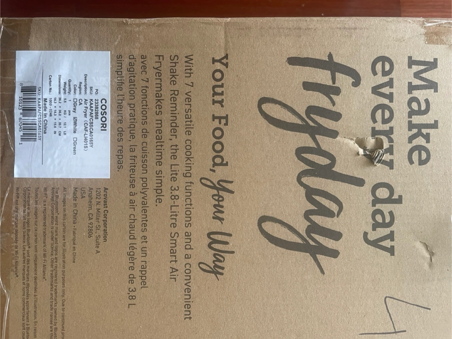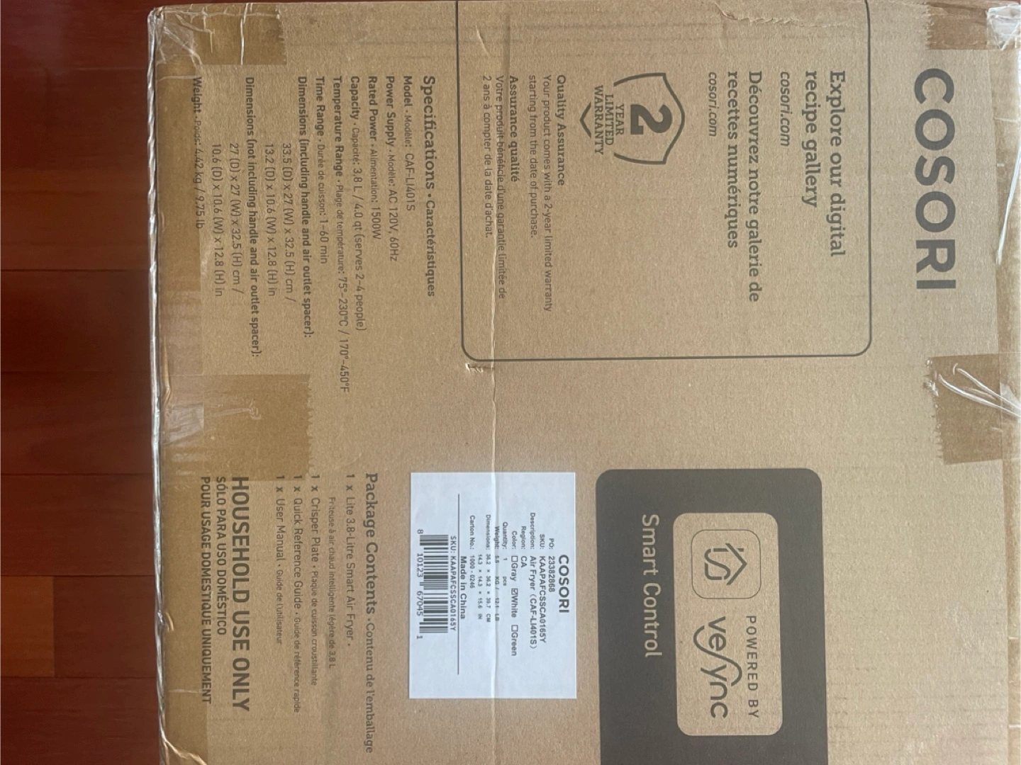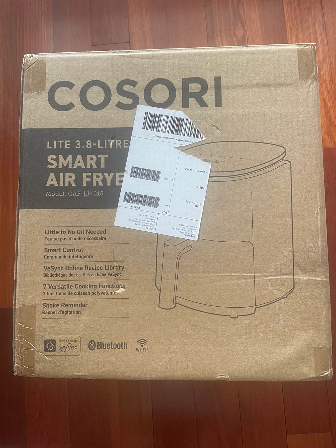Selling a Cosori Lite 3.8-Litre Smart Air Fryer This air fryer features 7 versatile cooking functions and a convenient shake reminder. It makes mealtime simple with its practical and simplified air frying. The box includes a user manual and a quick reference guide. It's perfect for serving 2-4 people! B04