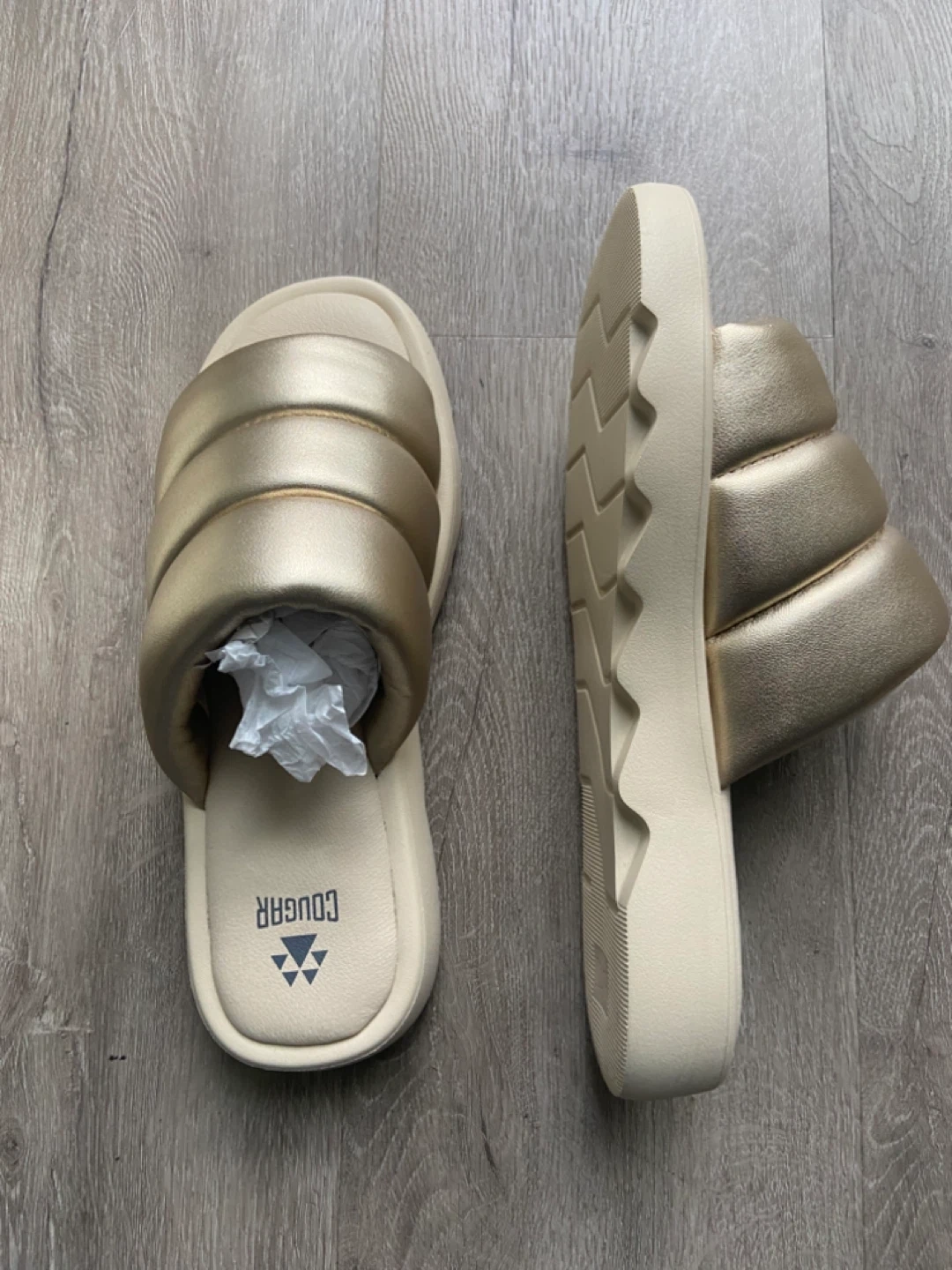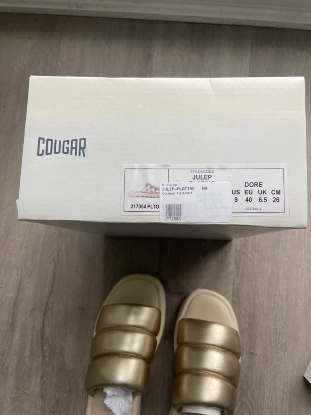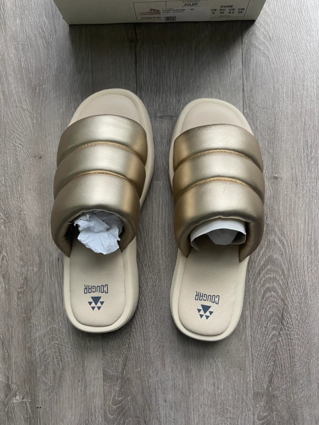 Selling a pair of Cougar Julep padded slides in a lovely gold colour, size 9. These are super comfy and stylish for everyday wear. Comes with the original box!