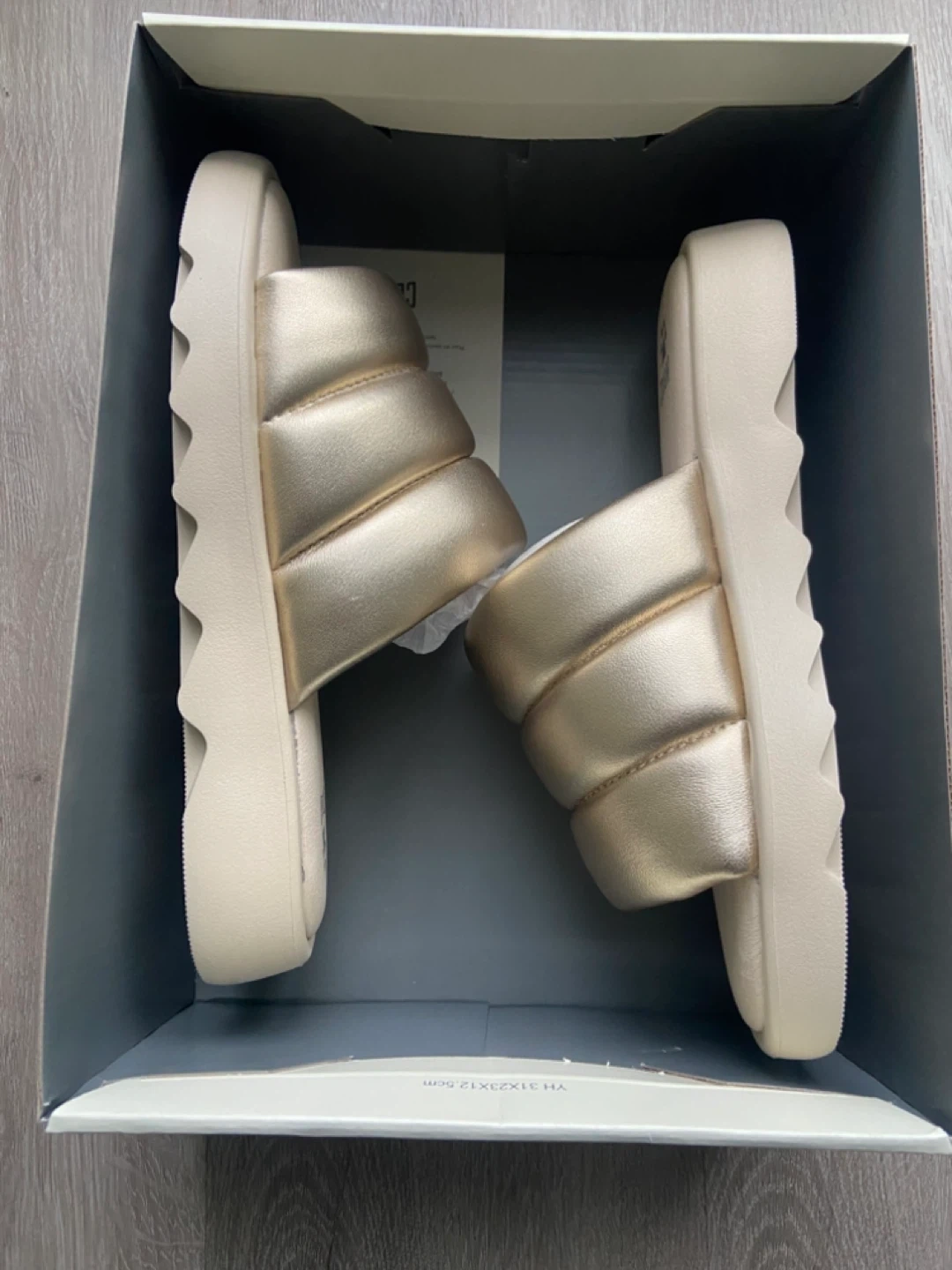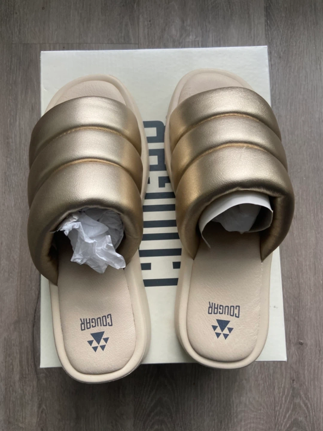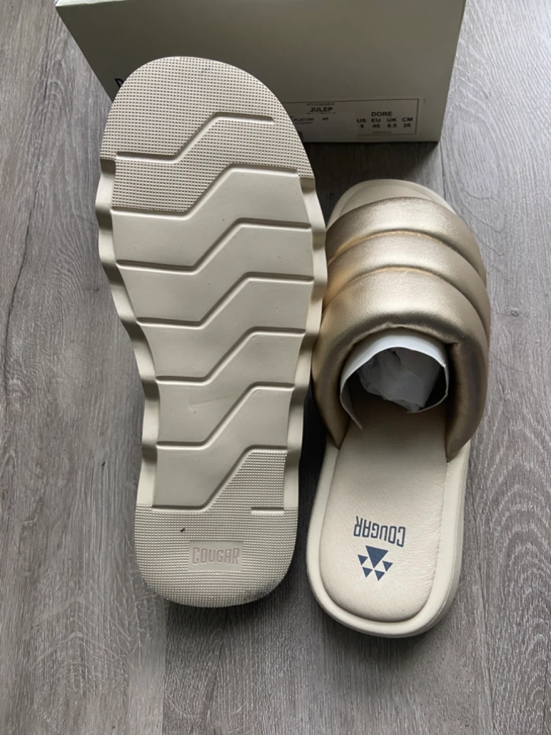 Selling a pair of Cougar Julep padded slides in a lovely gold colour, size 9. These are super comfy and stylish for everyday wear. Comes with the original box!
