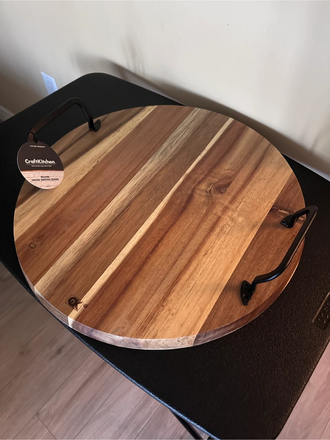 Selling a CraftKitchen Artisan Collection round wood serving board. It's made of acacia wood and measures 17 inches in diameter. Hand wash only to maintain its beauty!