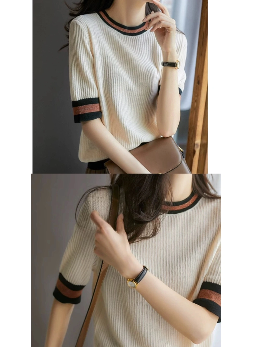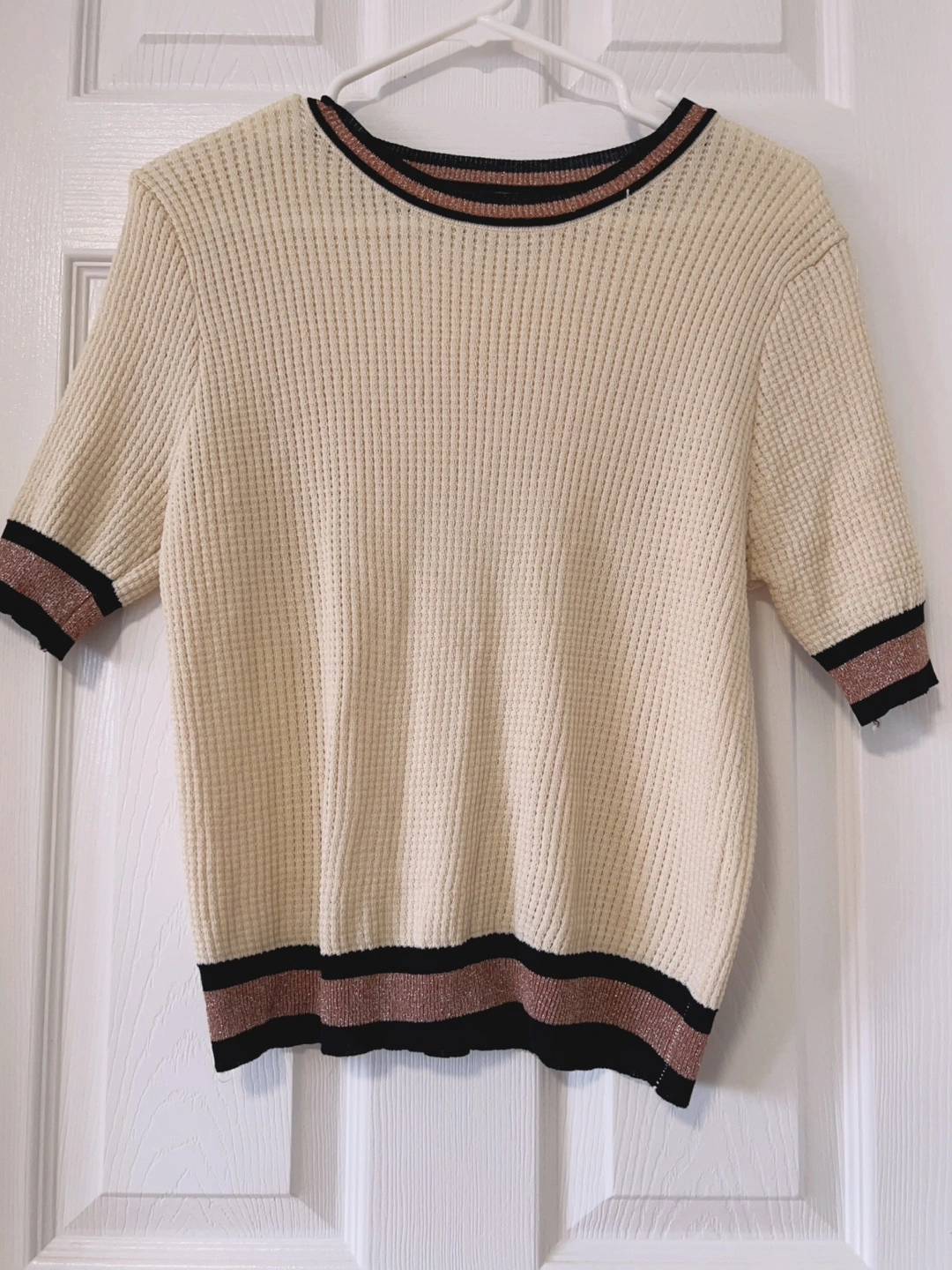 Women's short-sleeve cream-coloured knit top. Features ribbed texture and colour block detailing on the neckline and cuffs. Casual style, perfect for layering.