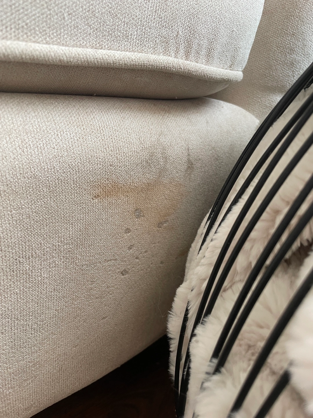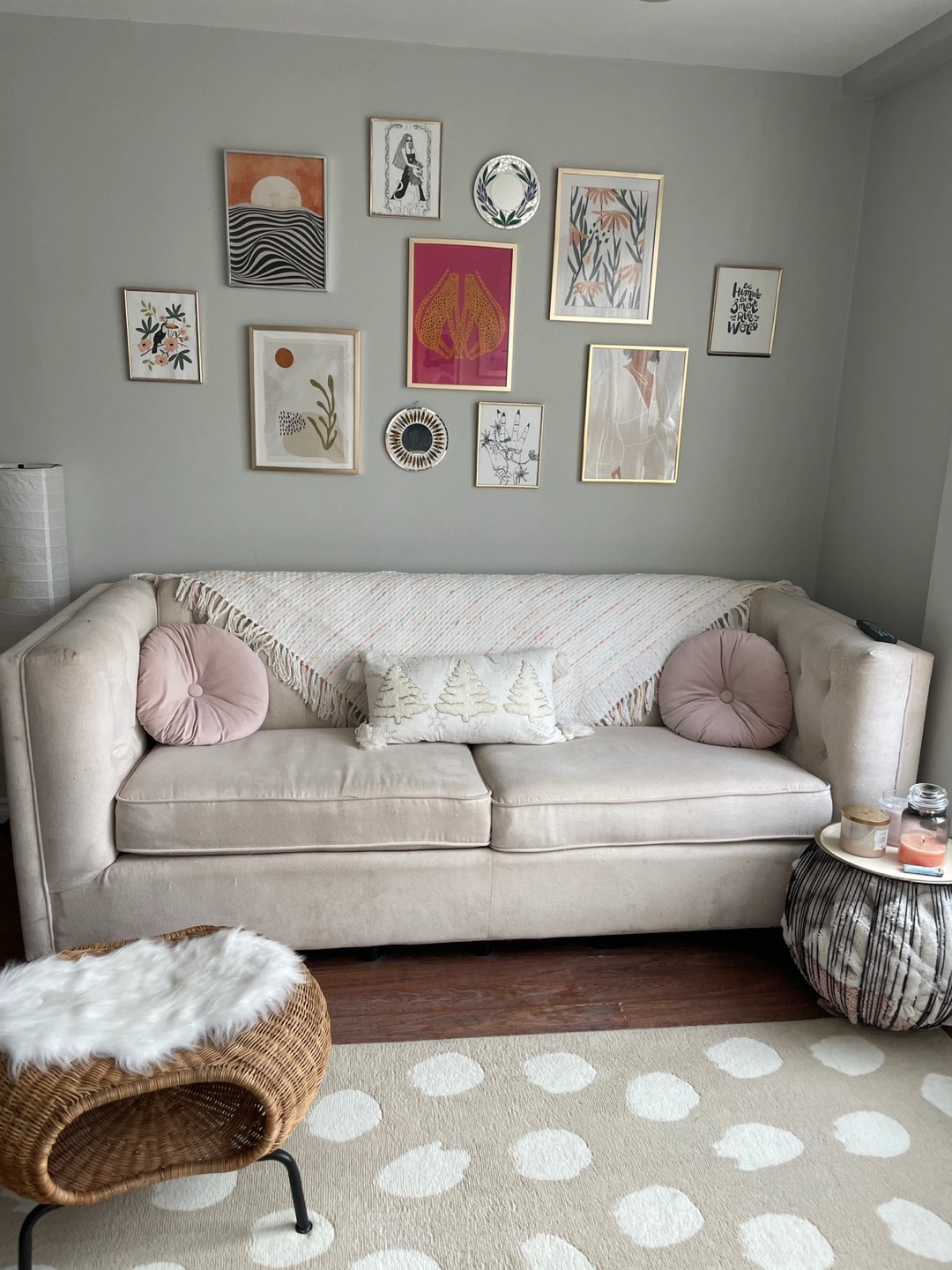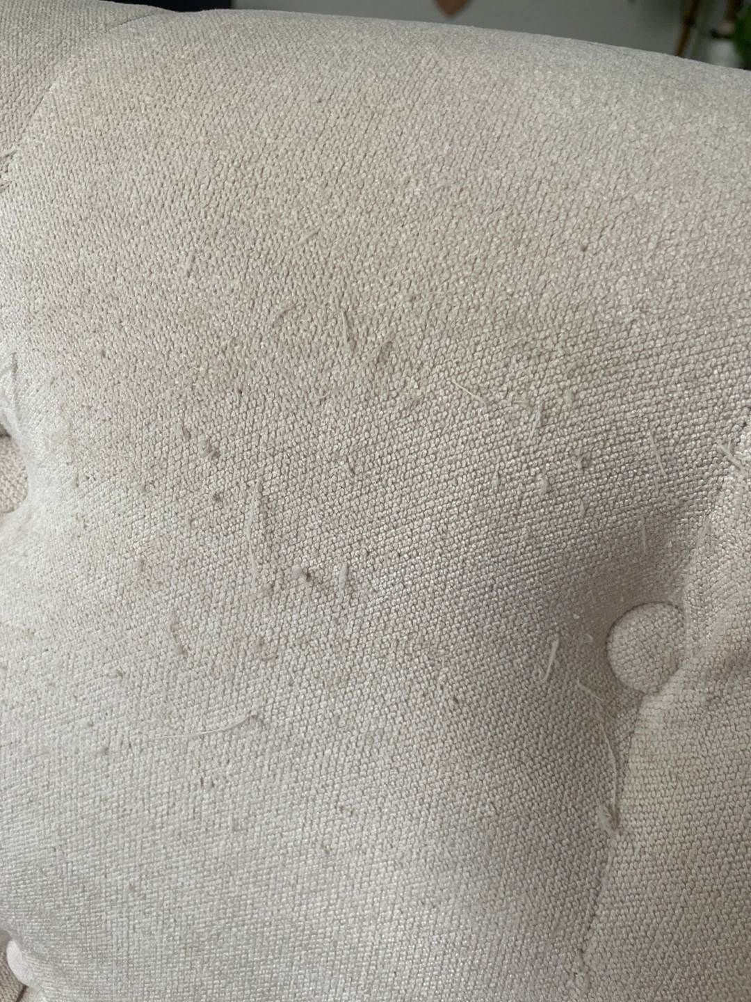Cream color sofa with tufted back, throw pillows and blanket not included. Measures 82 cm deep x 212 cm wide x 81 cm high (see pictures for conversions). Has some minor wear and tear but it’s a very comfortable and sturdy couch! Price is firm, no lowball offers please. Delivery is NOT available.