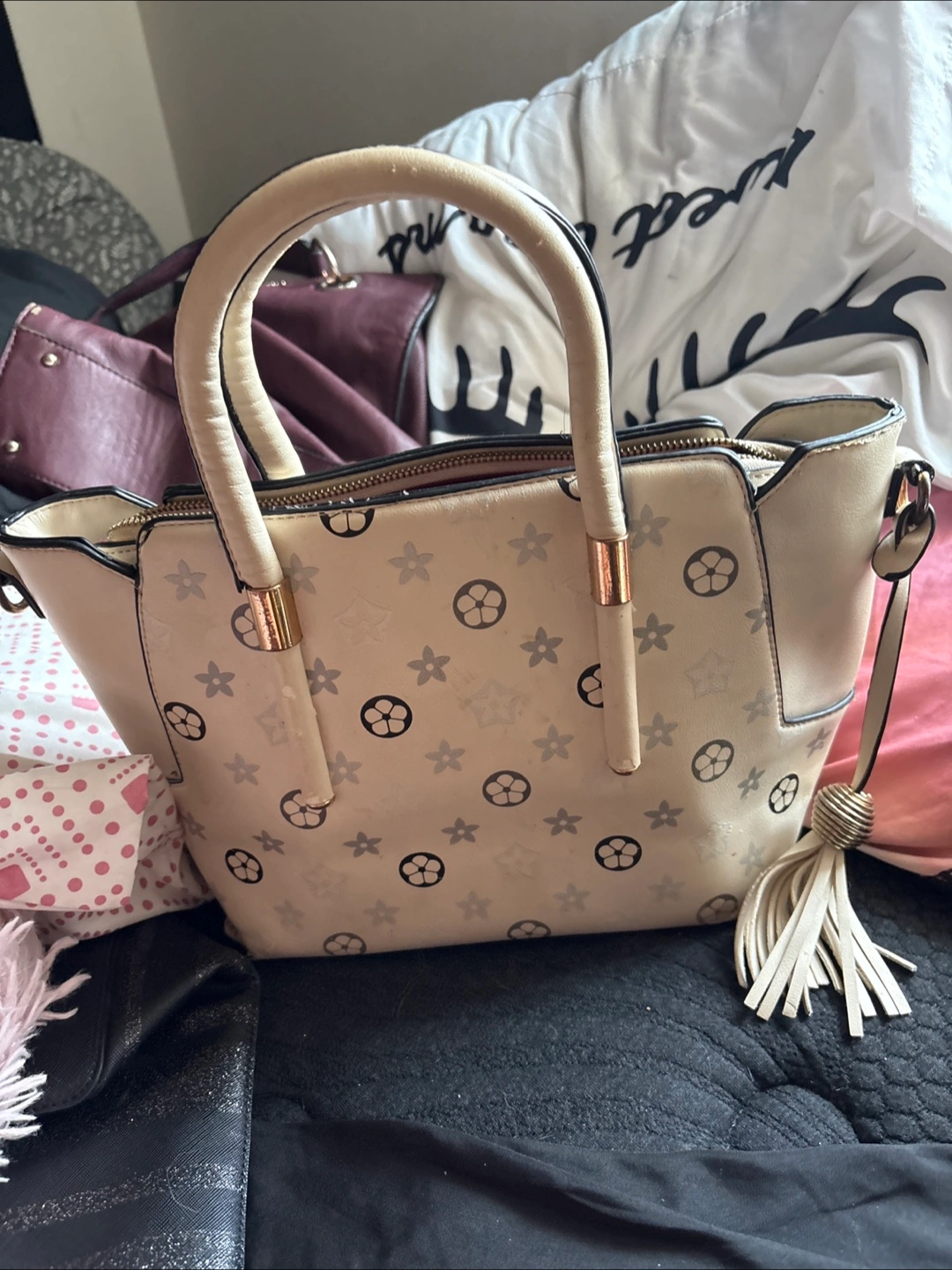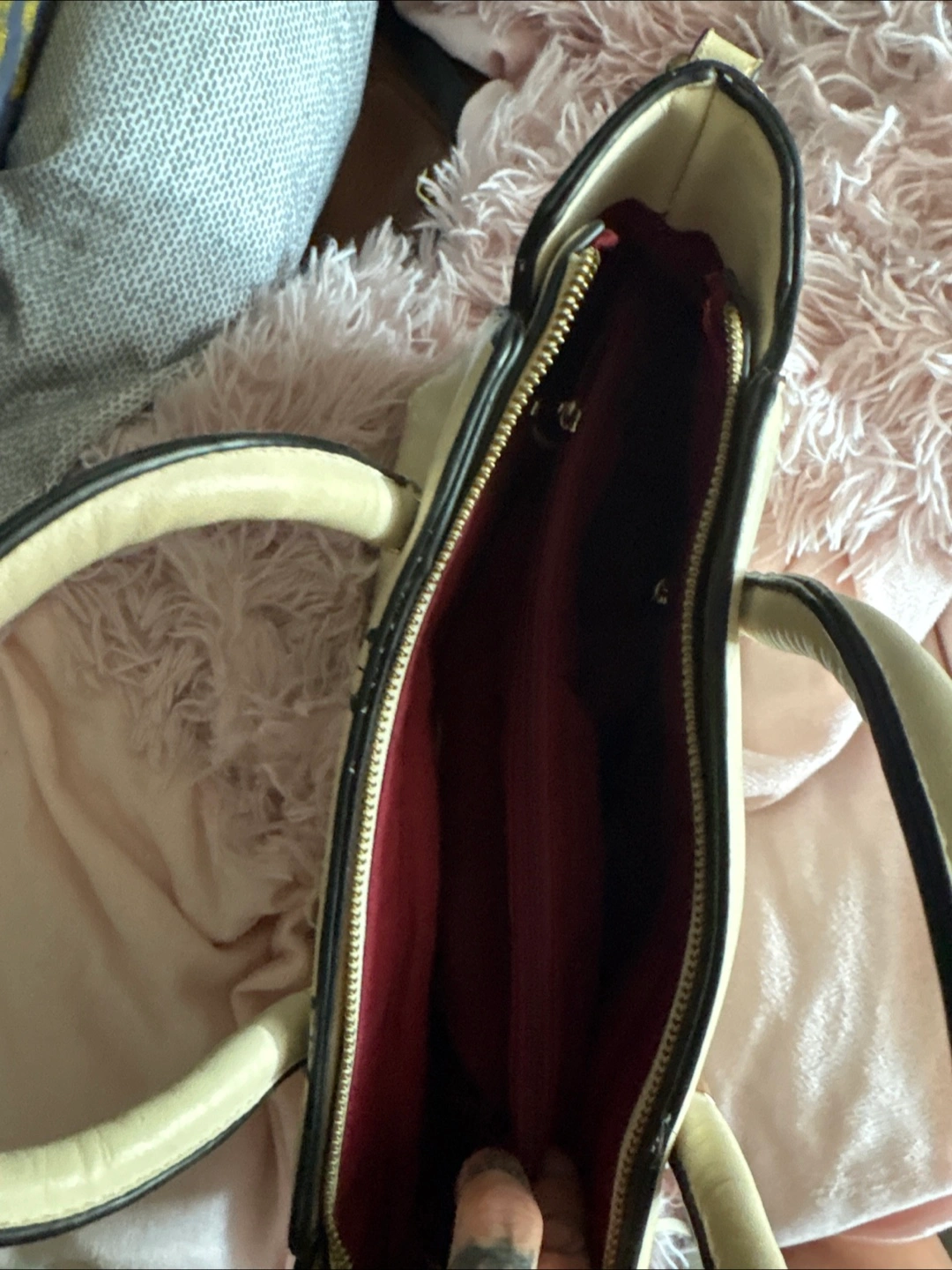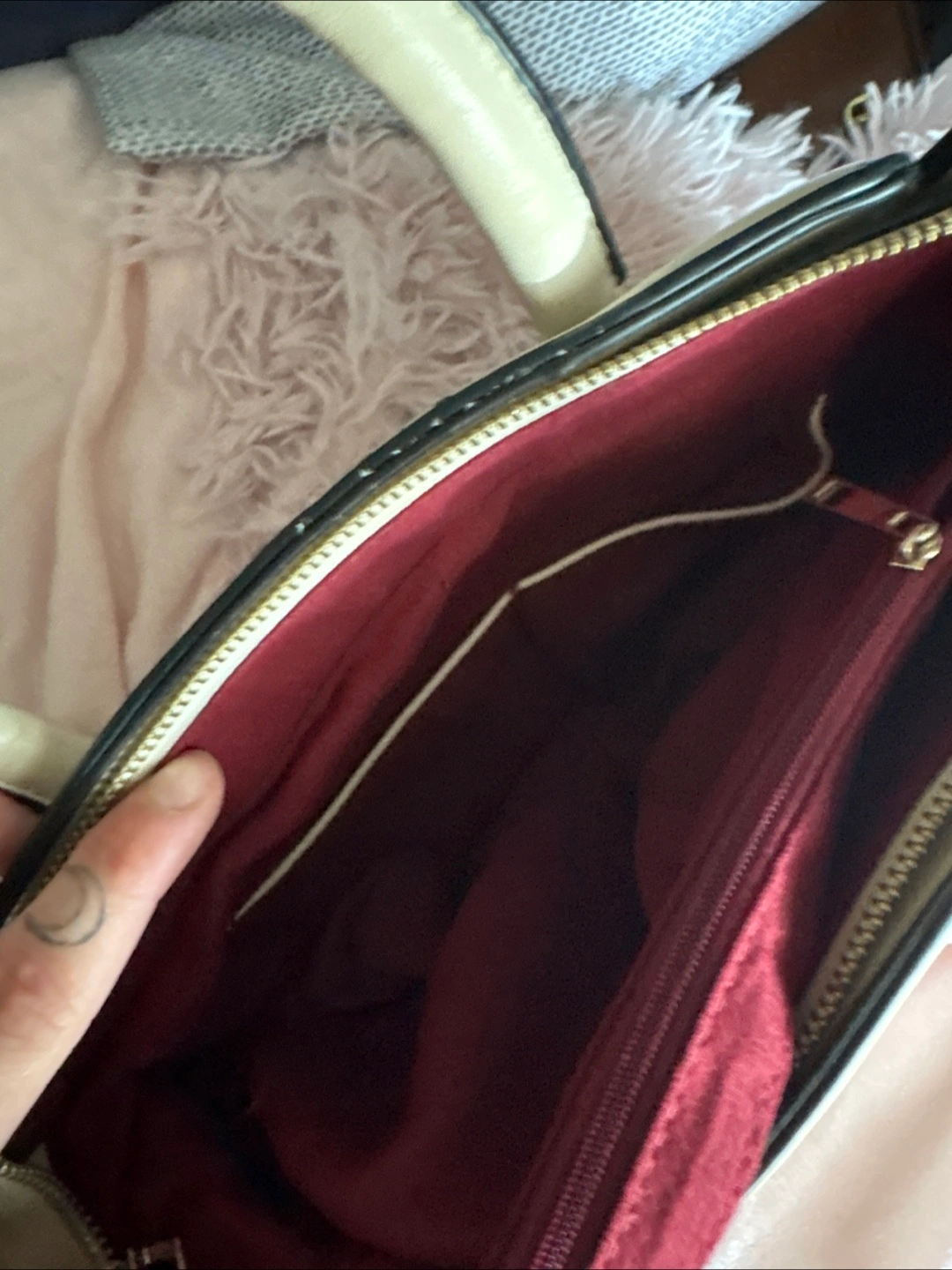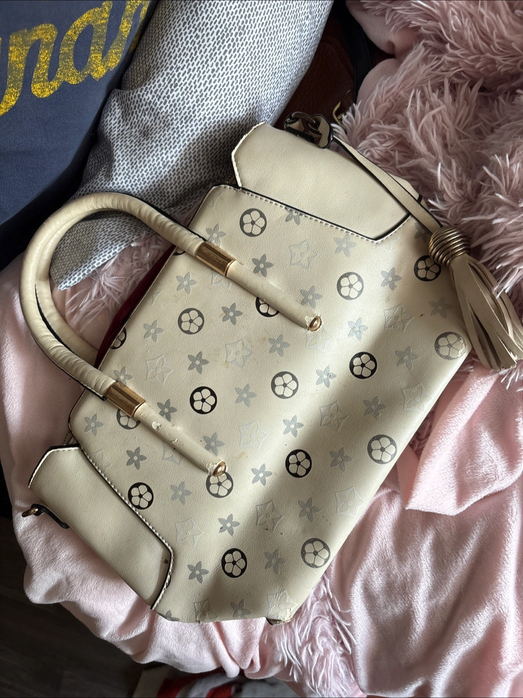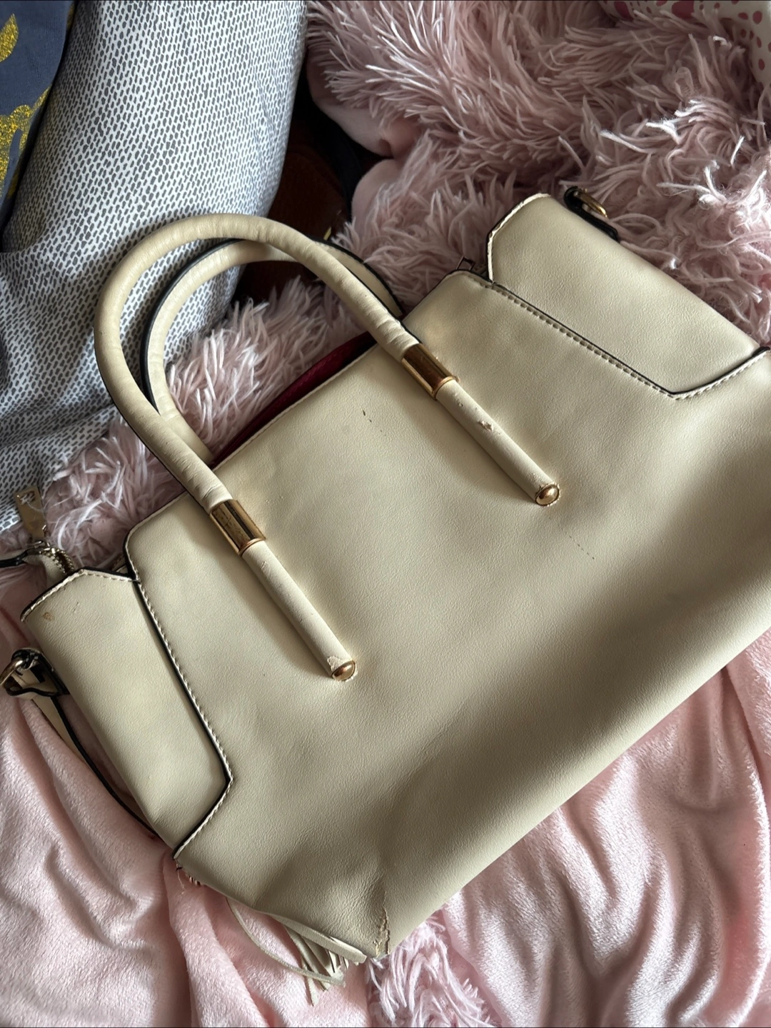 Selling a cream-coloured tote bag with a unique design! It has gold accents on the handles and a red interior. It's in good condition and ready for a new home. It’s has 2 sections on the inside I’ll take best offer