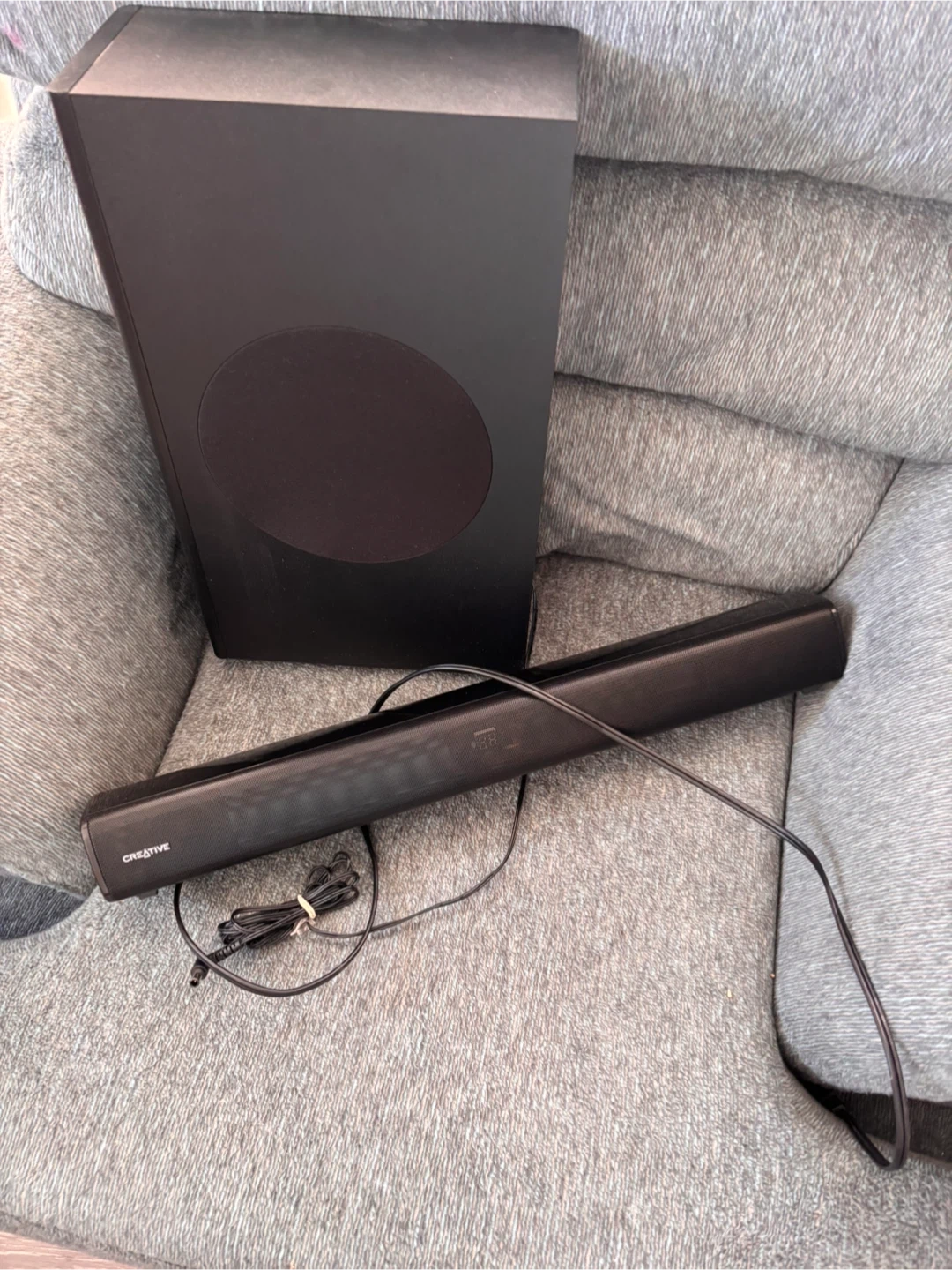 Selling a Creative Stage channel soundbar with a subwoofer. This is a great sound system for enhancing your TV or computer audio experience. It includes both the soundbar and the subwoofer, and all necessary cables. Enjoy clear audio and deep bass with this setup! It comes with optic wire to connect and also connects with Bluetooth. Pick up near march road $60 OBO