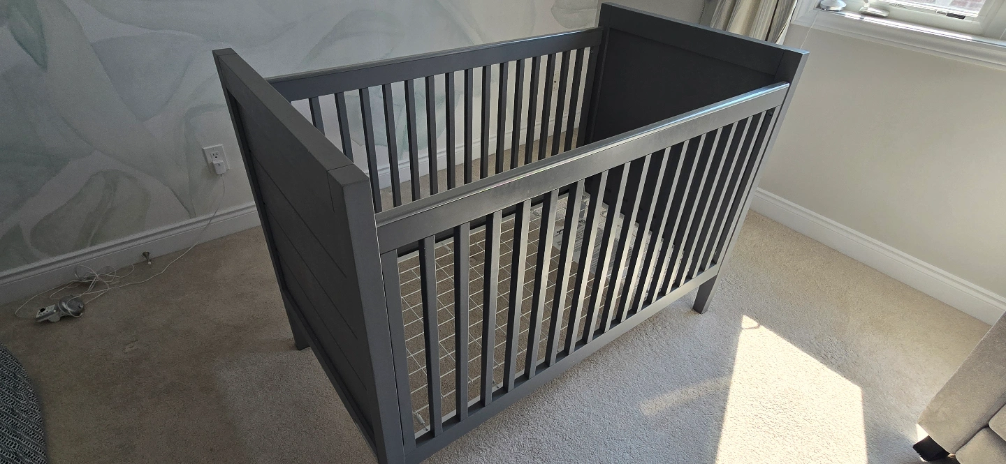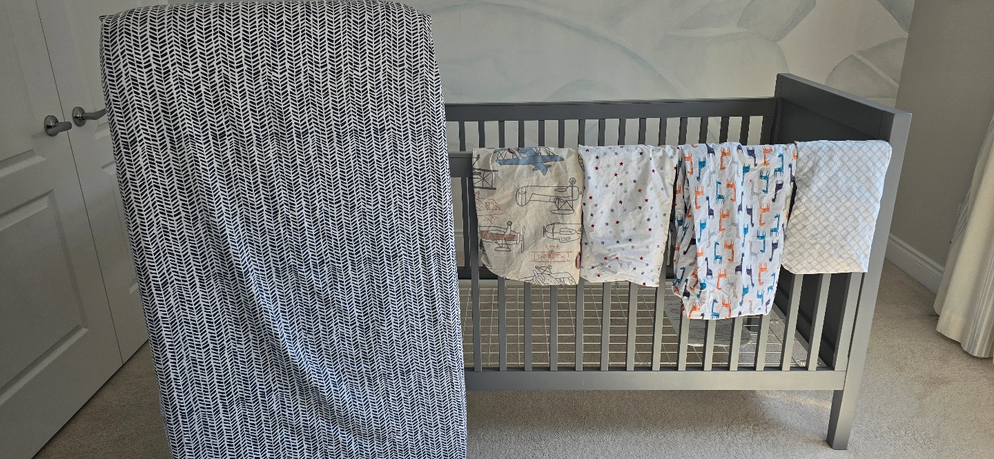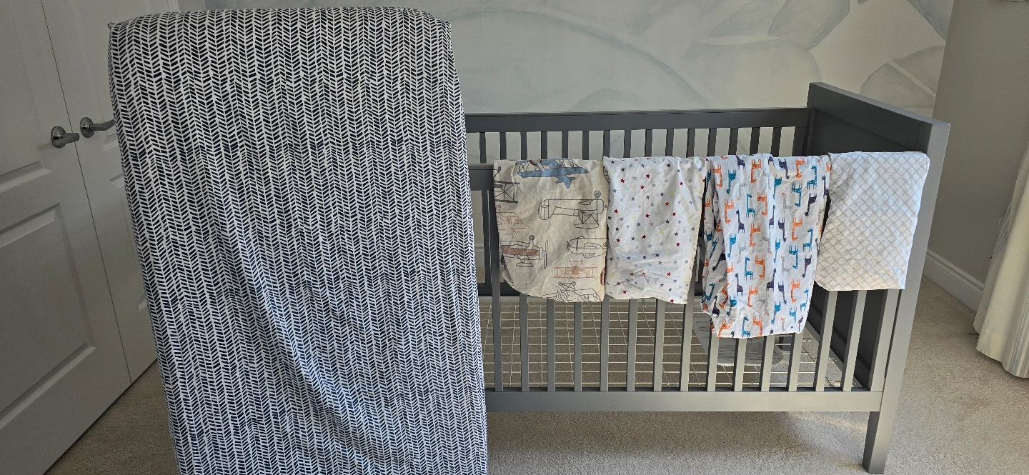 Selling crib, mattress and all 5 sheets as a package for $300. Crib: beautiful grey with square spindles. Adjustable to 3 different heights. Has various scratches. All required hardware included. Bought from Pottery Barn for $900. Sheets: all but one are from Pottery Barn. All (except Stars) are clean and look new. The Stars sheet has a couple of teal marks on it but it blends in so isn't very visible. Mattress: double sided - one side is 0-12 months and the other 12months + Available for immediate pick up. Serious buyers only please.