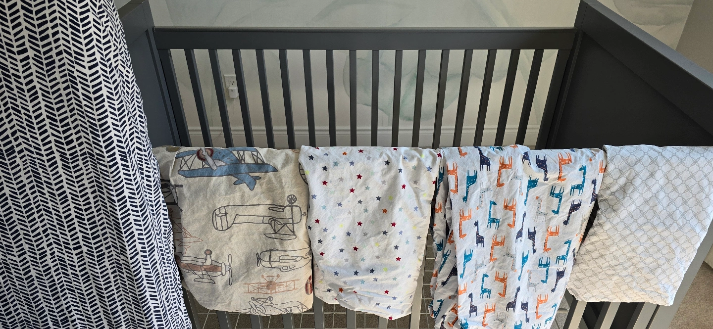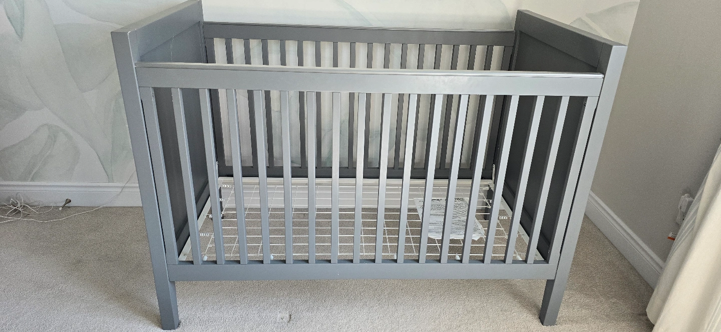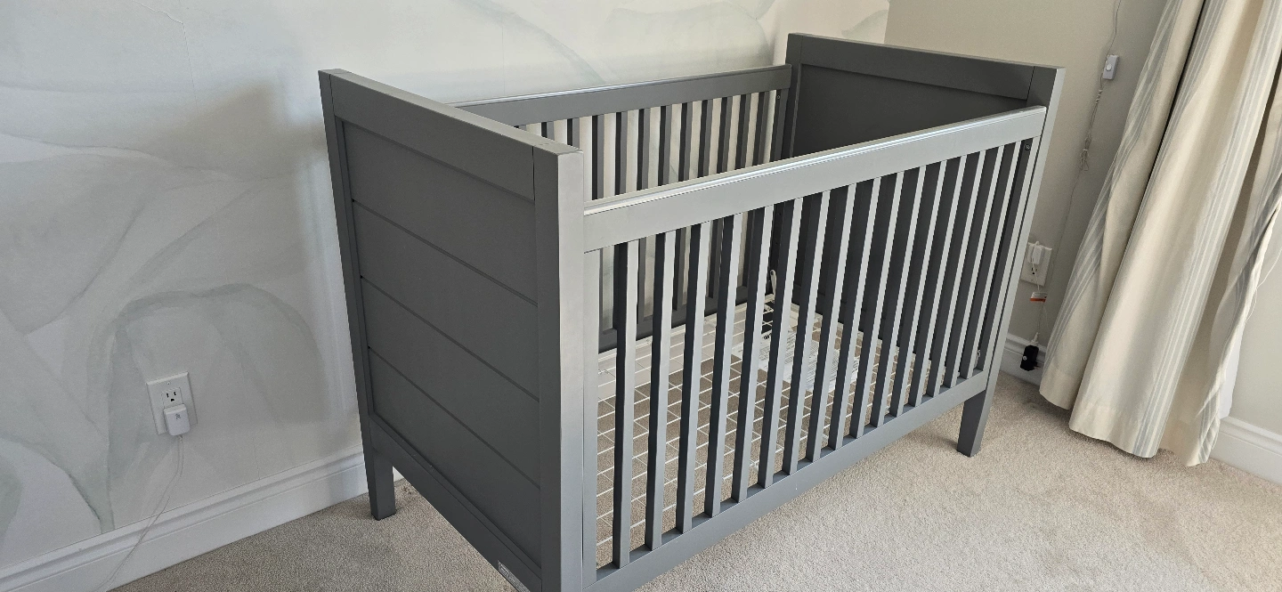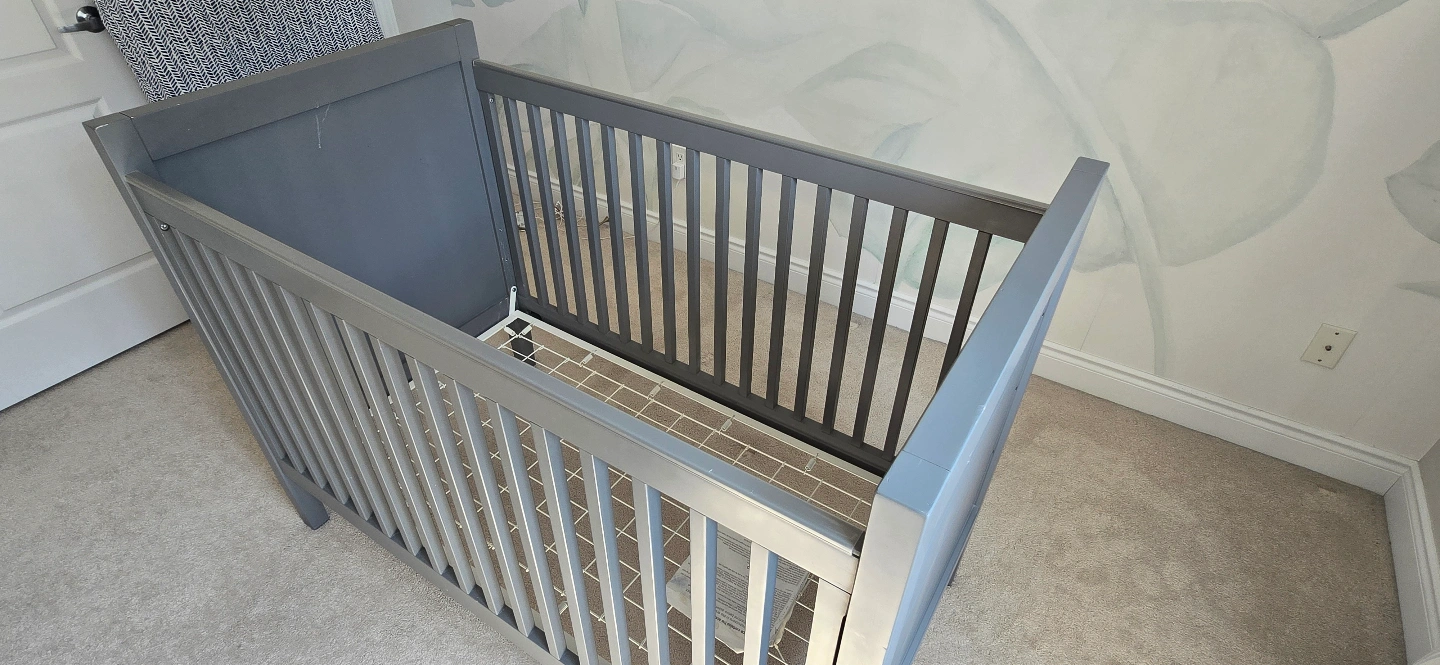 Selling crib, mattress and all 5 sheets as a package for $300. Crib: beautiful grey with square spindles. Adjustable to 3 different heights. Has various scratches. All required hardware included. Bought from Pottery Barn for $900. Sheets: all but one are from Pottery Barn. All (except Stars) are clean and look new. The Stars sheet has a couple of teal marks on it but it blends in so isn't very visible. Mattress: double sided - one side is 0-12 months and the other 12months + Available for immediate pick up. Serious buyers only please.