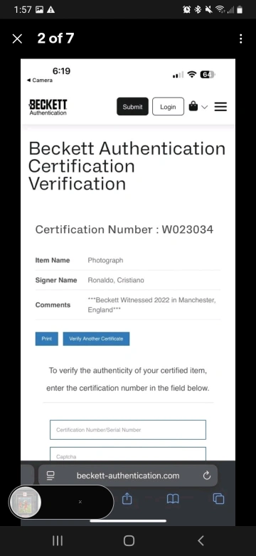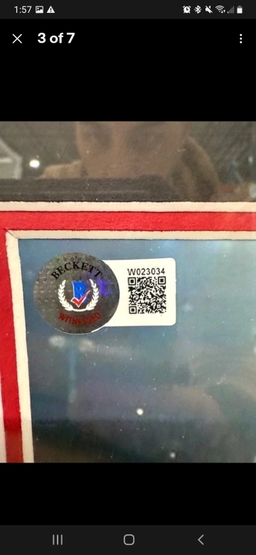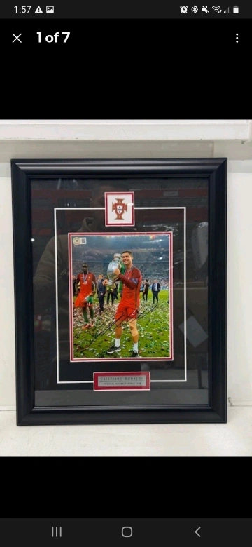 Selling a framed photograph of Cristiano Ronaldo, authenticated by Beckett. The photograph is signed and comes with Beckett Witnessed authentication, verified in 2022 in Manchester, England. It measures approximately 21 inches by 25 inches.