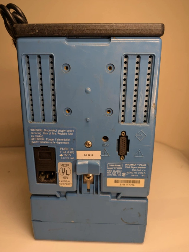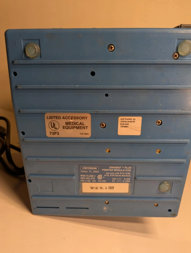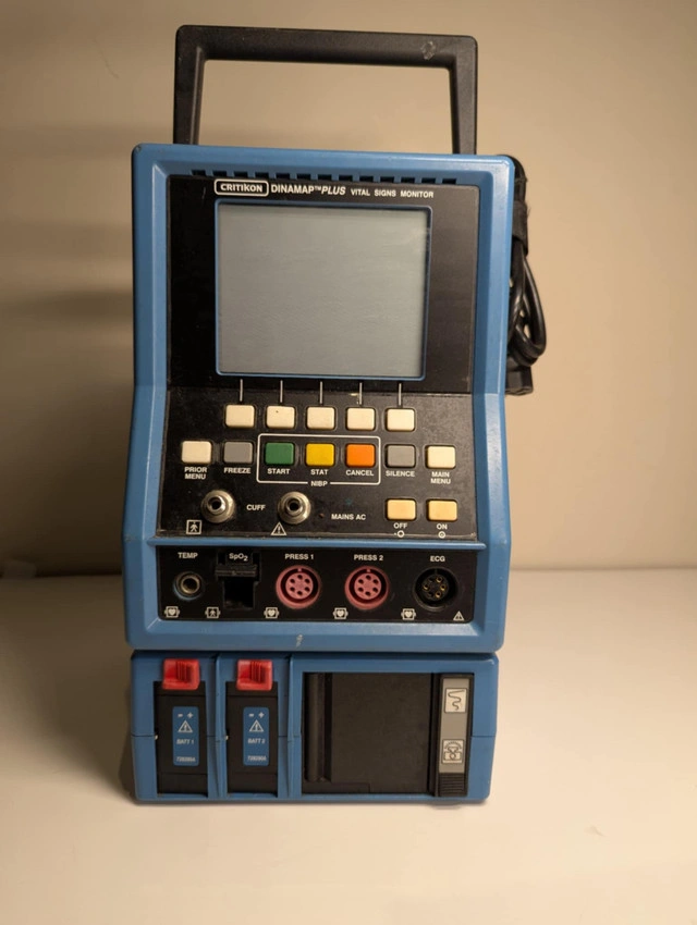 Critikon Dinamap Plus Vital Signs Monitor. Unit has been tested for basic power only. Selling as-is, for parts, repair, or collectible purposes. Not intended or certified for medical use. Key Features: ⚡ Model: Dinamap Plus Portable design with carry handle Front panel with SpO2, NIBP, and ECG ports Dual battery slots | AC power input Built-in printer module Contact: Message directly here or call/text 289-788-8085 with any questions — happy to help.