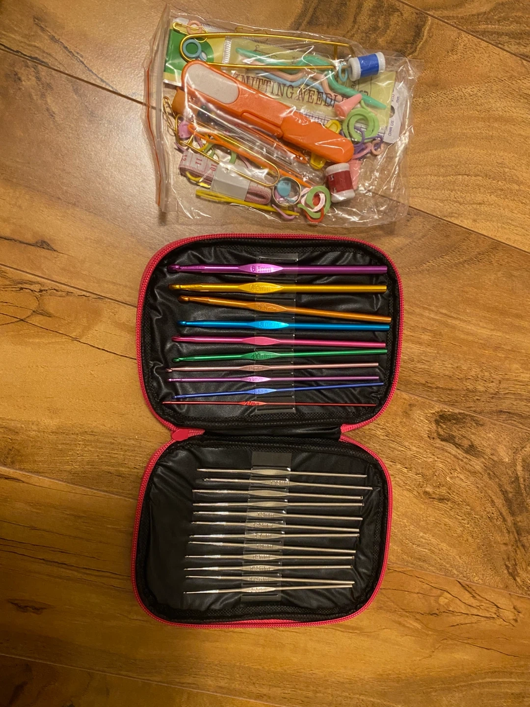Selling a complete crochet hook set! It comes with a variety of colourful hooks in different sizes, neatly organized in a pink carrying case. Also included are some extra knitting accessories. Perfect for beginners or experienced crocheters looking to expand their collection