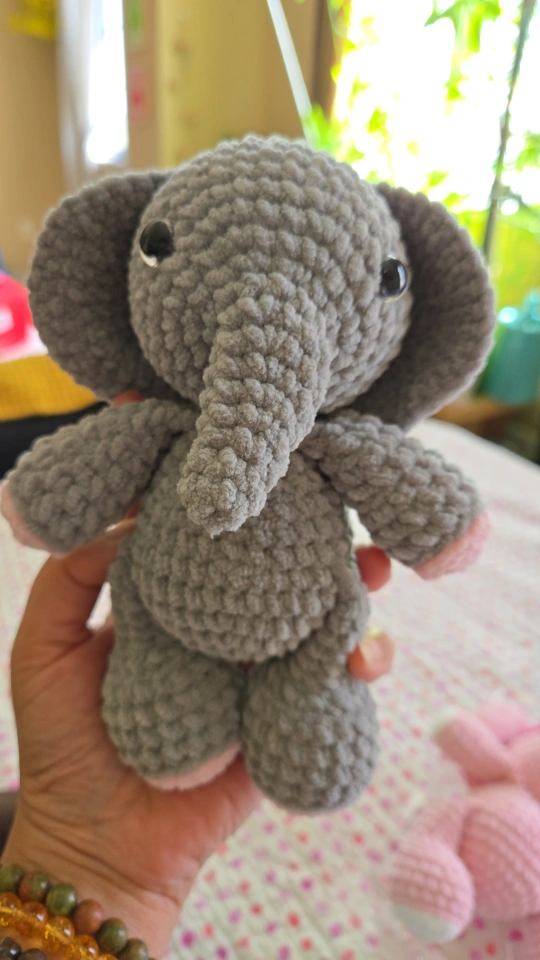 Selling this adorable crocheted elephant plushie! It's a soft, cuddly friend, perfect for kids or anyone who loves cute handmade toys. The elephant is grey with pink accents and is in great condition. It's looking for a new home to be loved and cherished
