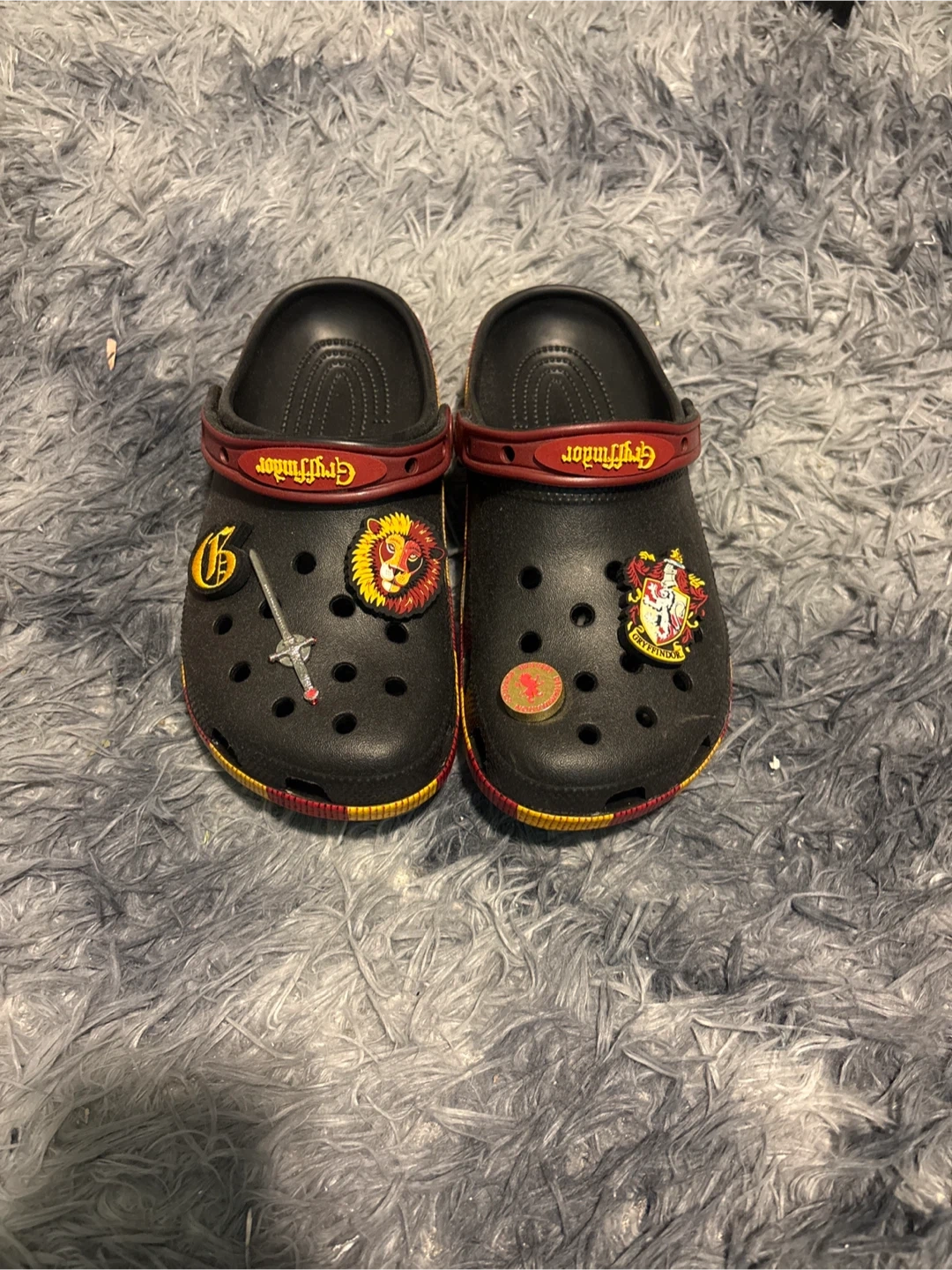 Selling a pair of Crocs with a Harry Potter Gryffindor theme! They are black with red and gold accents, and feature Gryffindor-themed Jibbitz. Perfect for any Harry Potter fan!