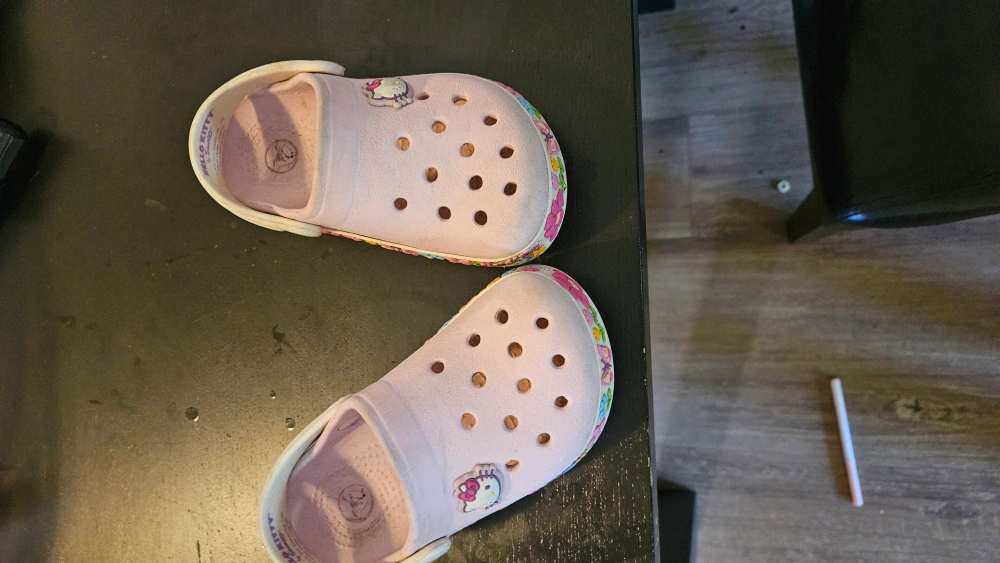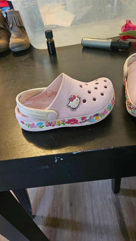 These adorable Crocs feature a cute Hello Kitty design! They're in a toddler size 9 and are perfect for your little one. They are pink with a colourful floral design around the base of the shoe. Great for everyday wear!