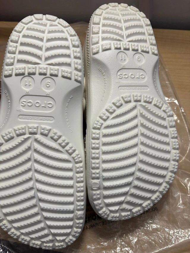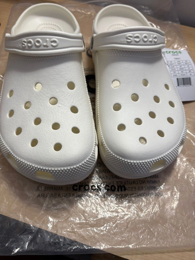 These are a pair of white Crocs in a men's size 9. These Crocs are in new condition, never worn. Get ready to rock these iconic and comfy shoes, perfect for adding a touch of fun to any outfit. After all, who can resist the allure of a pair of Crocs? Grab them while you can! * Brand: Crocs * Size: Men's 9 * Colour: White * Condition: New If the ad's still up, you know these Crocs are still waiting for their Cinderella (or Prince Charming)!