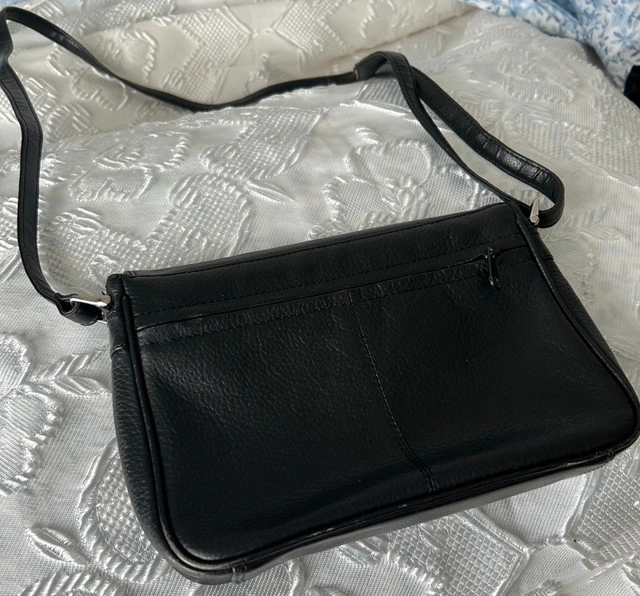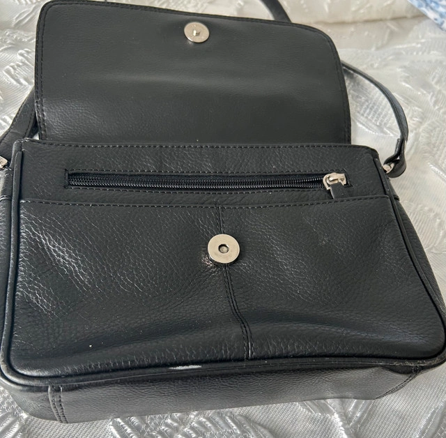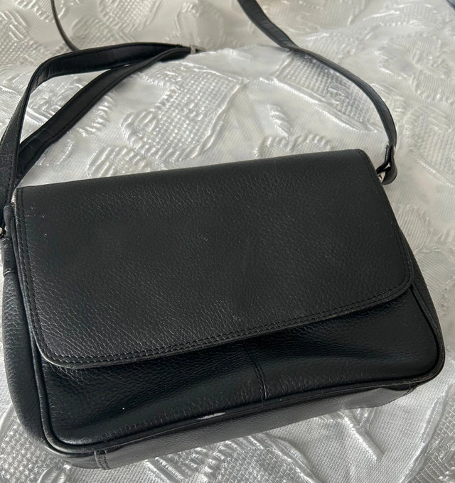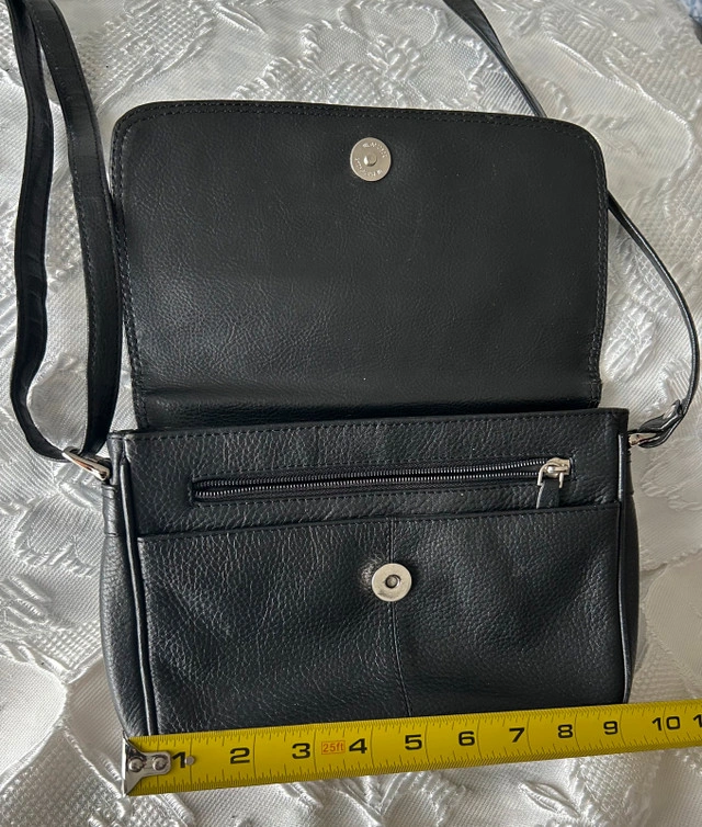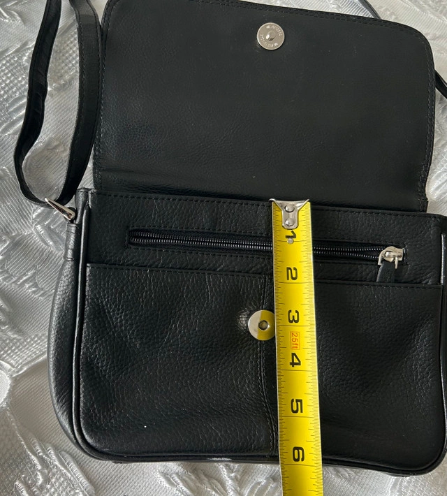 This is a used black leather crossbody bag, perfect for everyday use with dimensions of approximately 9 inches in width and 6 inches in height. It's a stylish and practical accessory. * Material: Leather * Colour: Black * Style: Crossbody * Dimensions: Approx. 9" x 6"