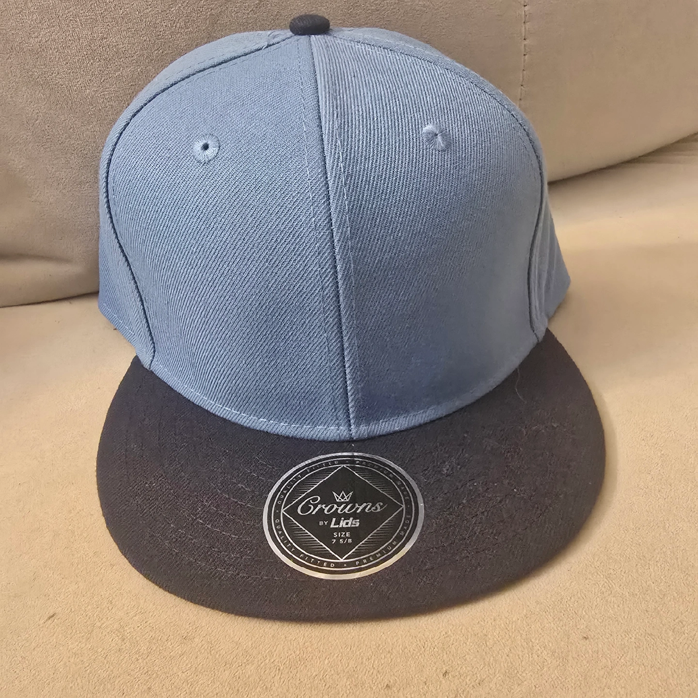 Selling a Crowns by Lids fitted hat in size 7 5/8. It features a stylish two-tone design with a light blue crown and a dark gray brim. Great for completing any casual outfit!