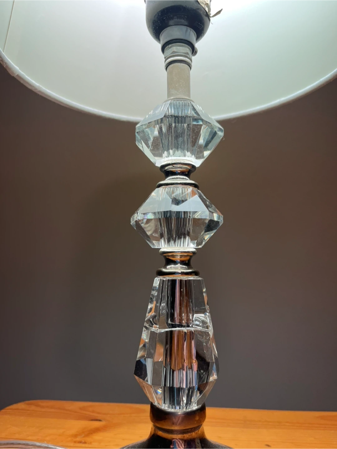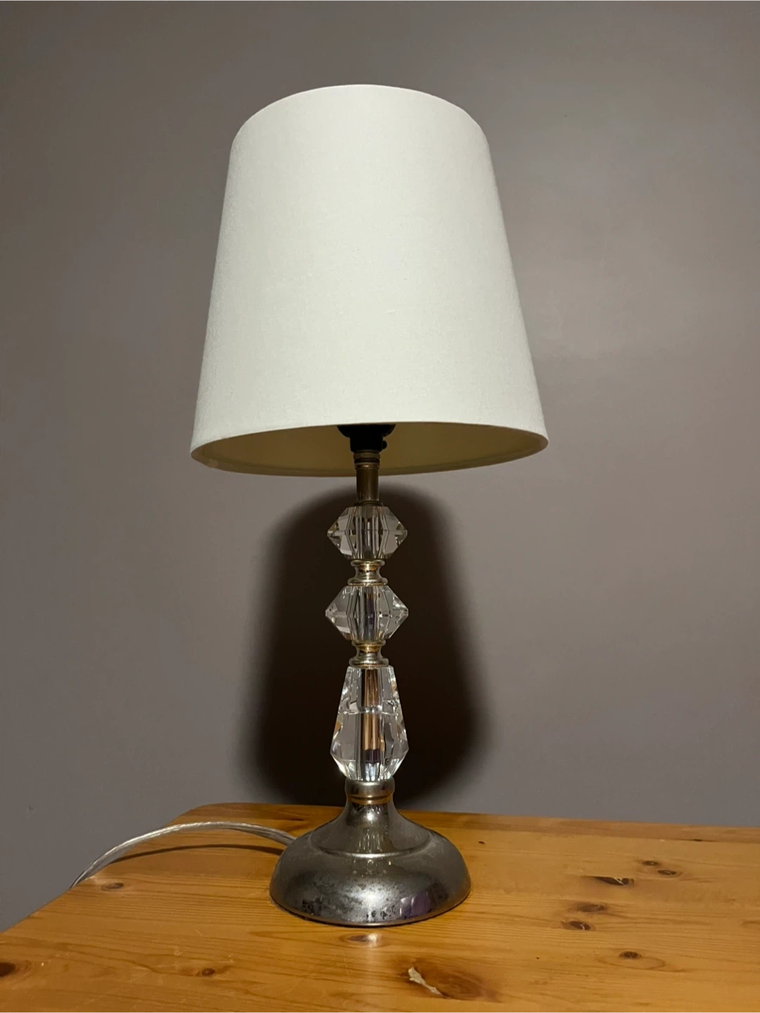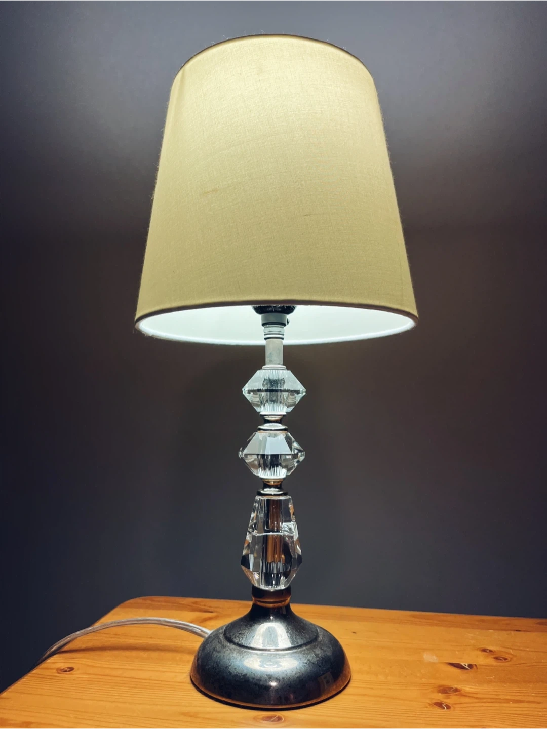 Table lamp with push switch (see picture 3) Lampshade is cream coloured, looks warmer toned with a warm bulb. Included photos on and off so you can see that it works & the colour range :) Great condition, base could use a polish, but works perfectly! Just don’t have a good spot for it anymore