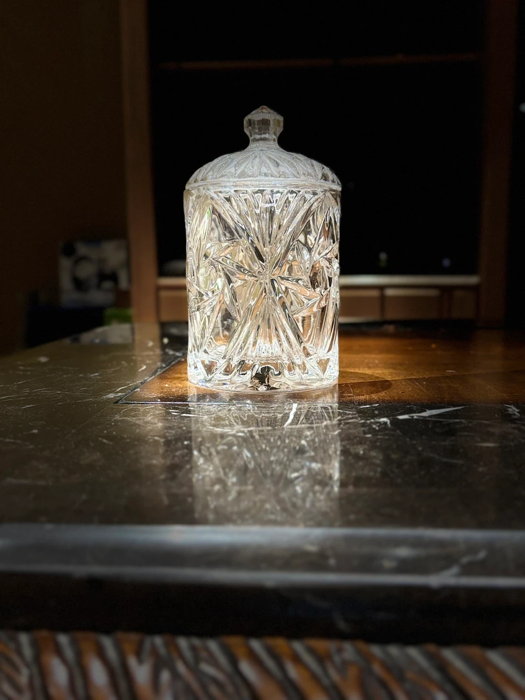 Selling a beautiful crystal candy dish with a lid. It's in great condition and would look lovely on any table or counter. The intricate design catches the light beautifully, adding a touch of elegance to your home decor