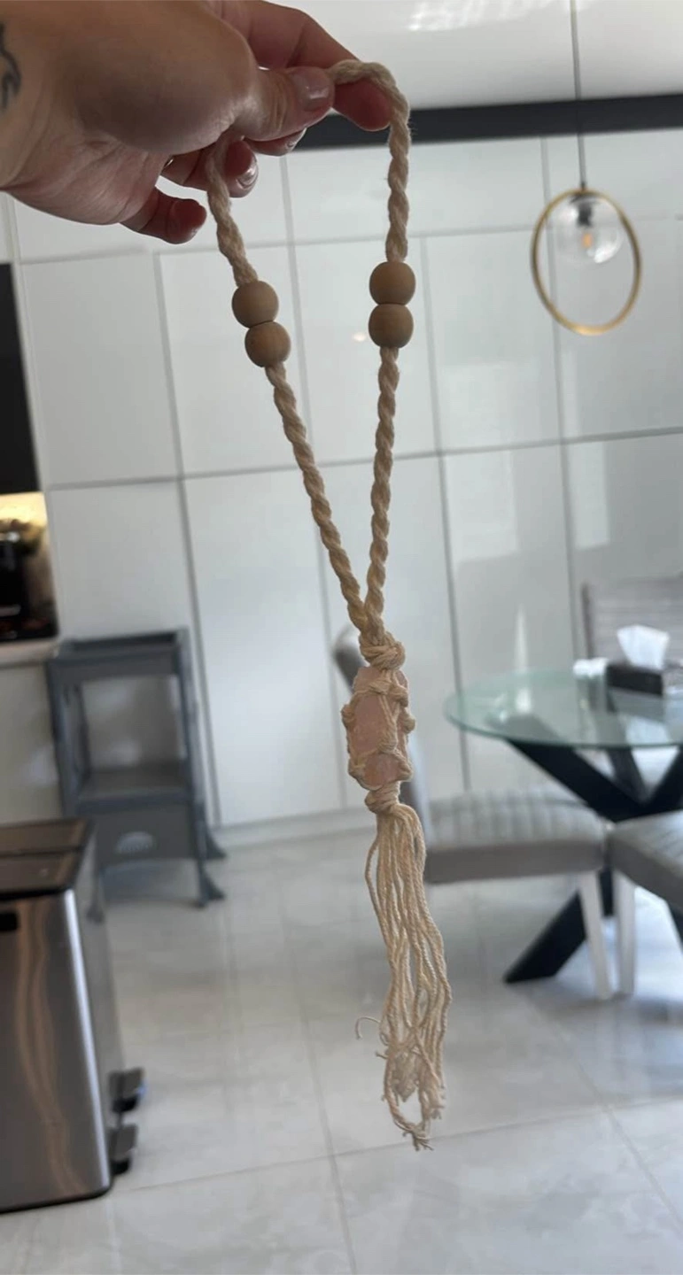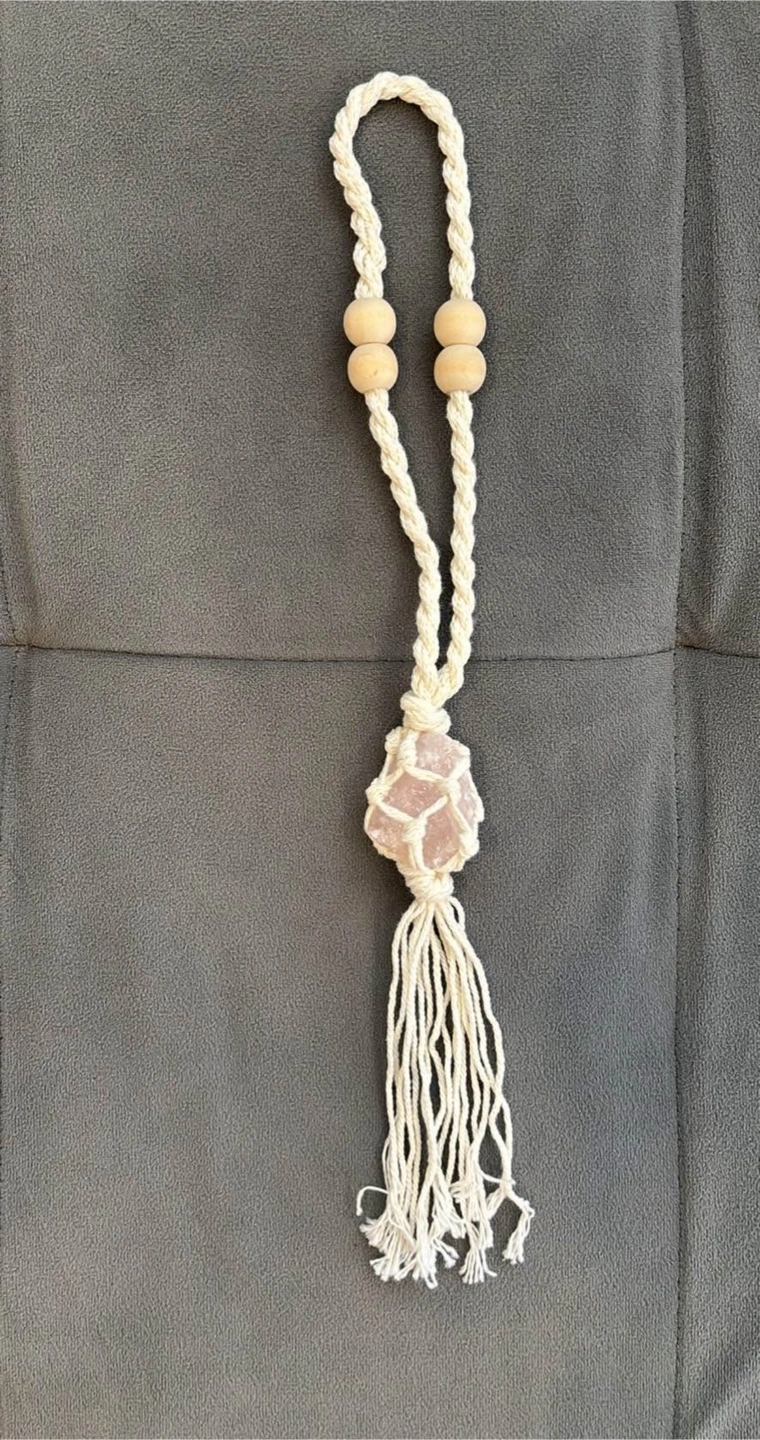 This is a handmade crystal car charm. It features a rose crystal wrapped in a natural rope with wooden beads. It's perfect for adding a touch of zen to your car!