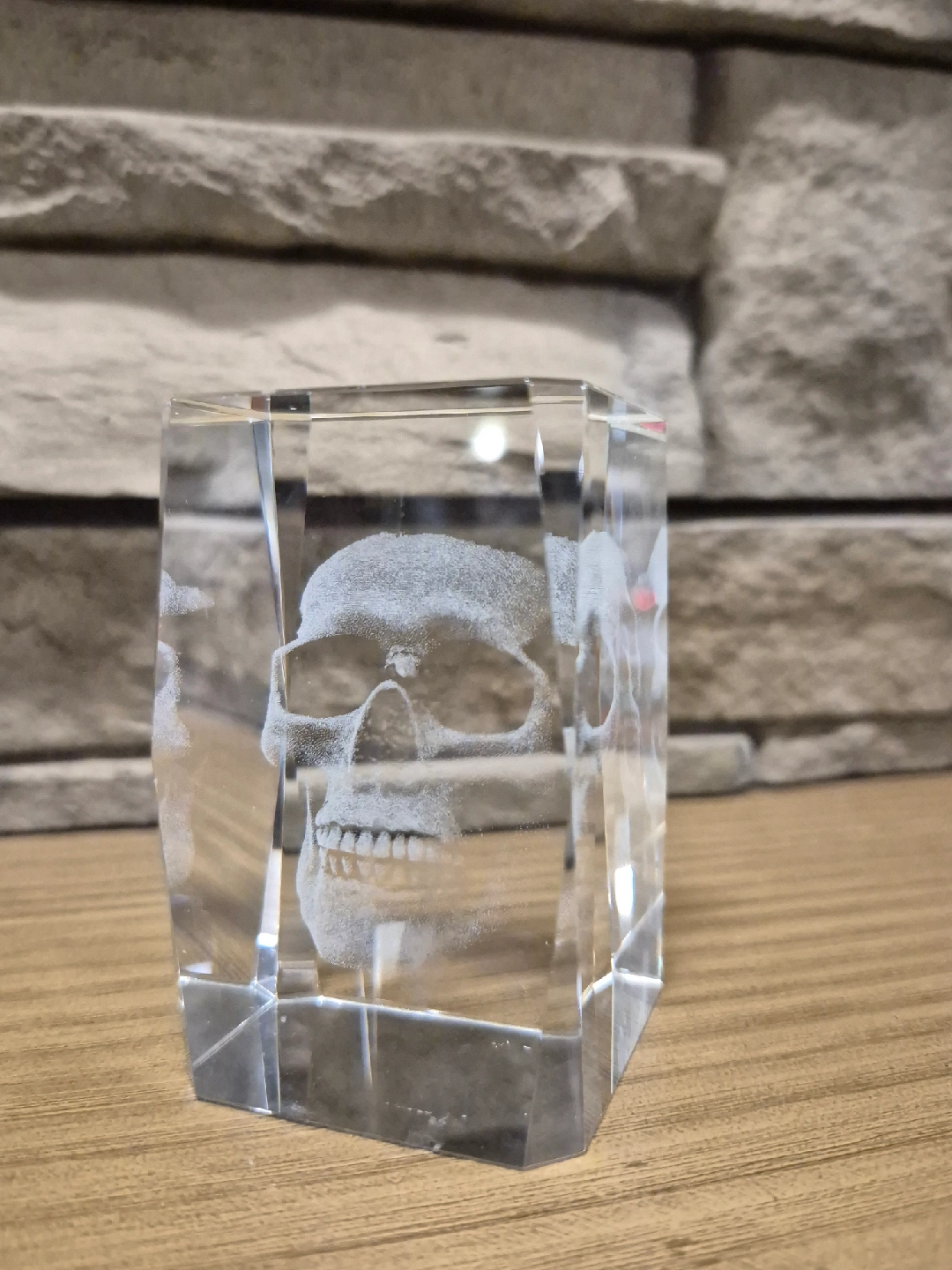 Selling a crystal cube with a skull design inside! It's in great condition and would make a unique addition for HALLOWEEN