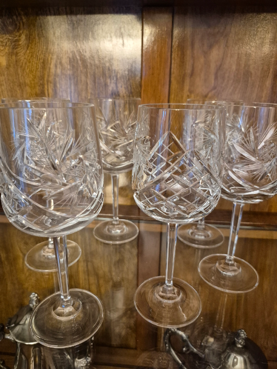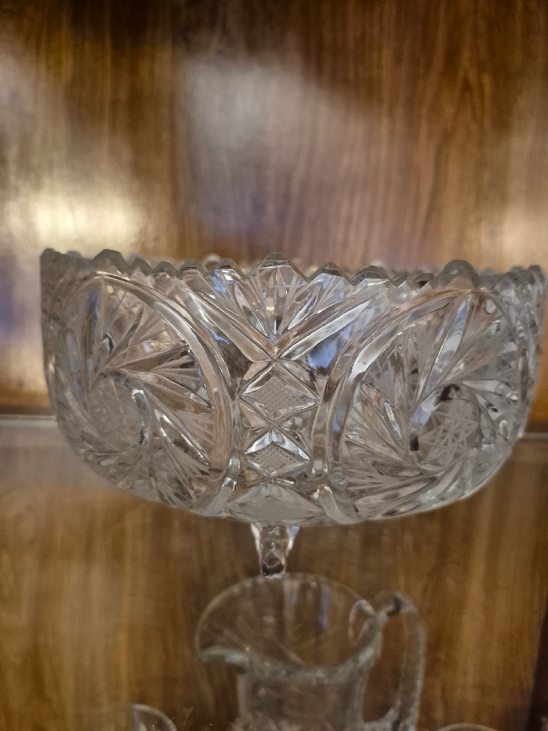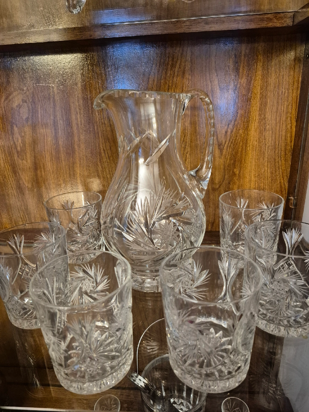 Selling a beautiful crystal sets that includes wine glasses. Pitcher and glasses. bowl. cake platter. The intricate designs catch the light wonderfully, adding a touch of elegance to any occasion