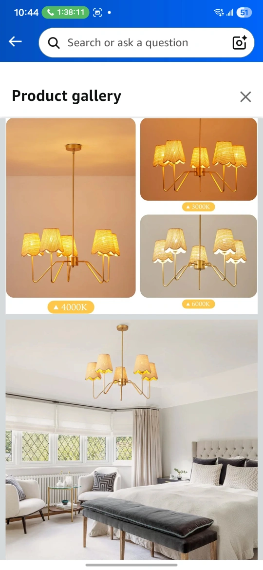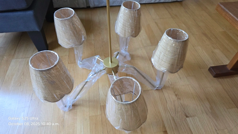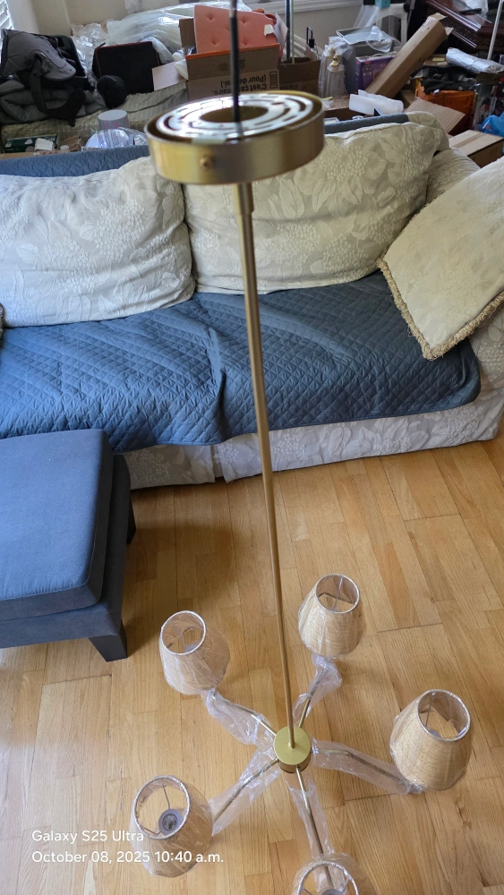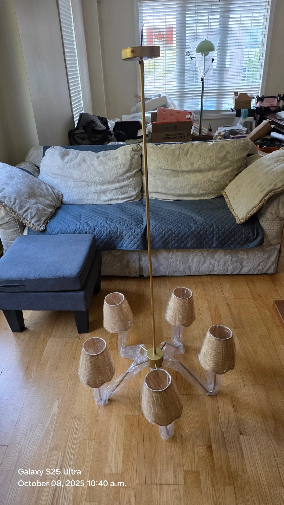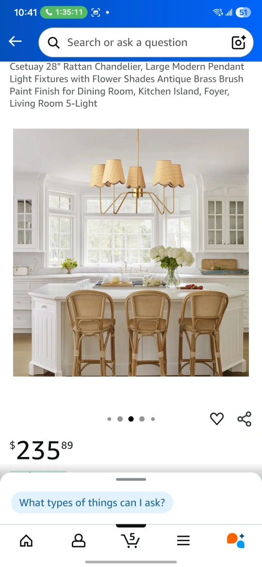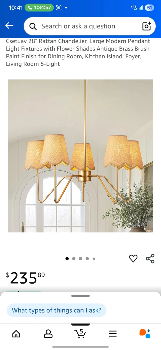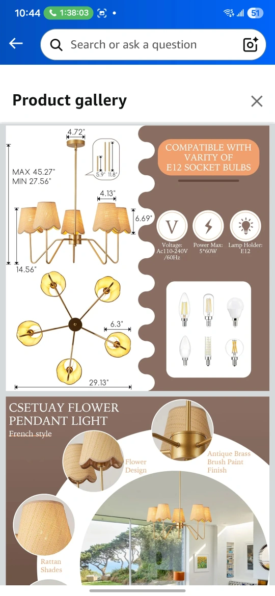 Selling a CSETUAY flower pendant light in a French style! It features rattan shades and an antique brass brush paint finish. Compatible with E12 socket bulbs, voltage AC110-240V, power max 5*60W, lamp holder E12. It measures about 45.27" max height and 29.13" wide original price $235