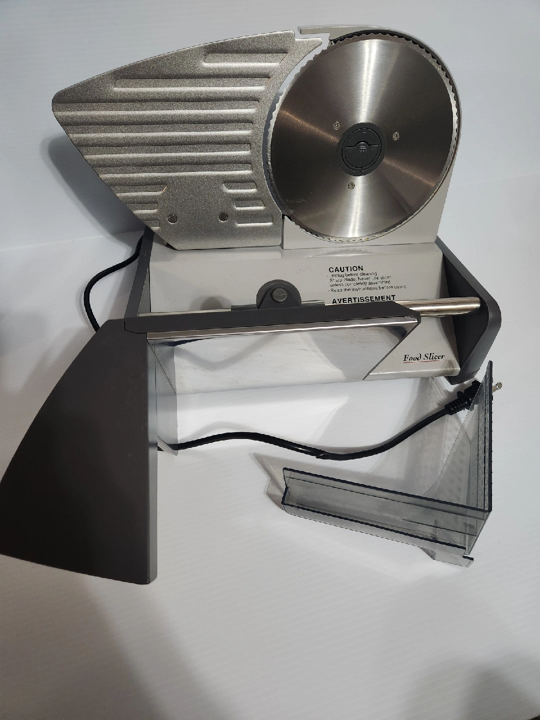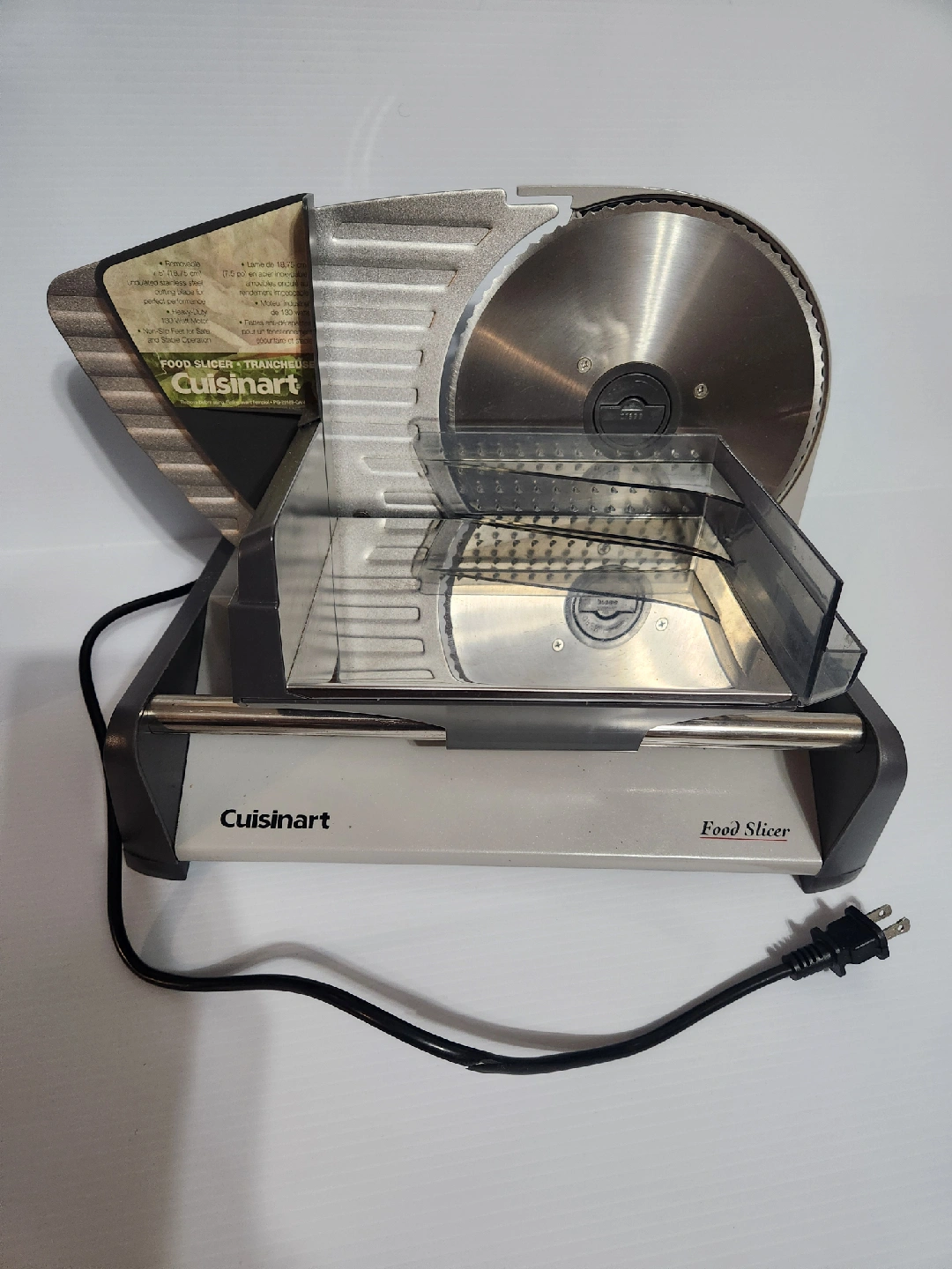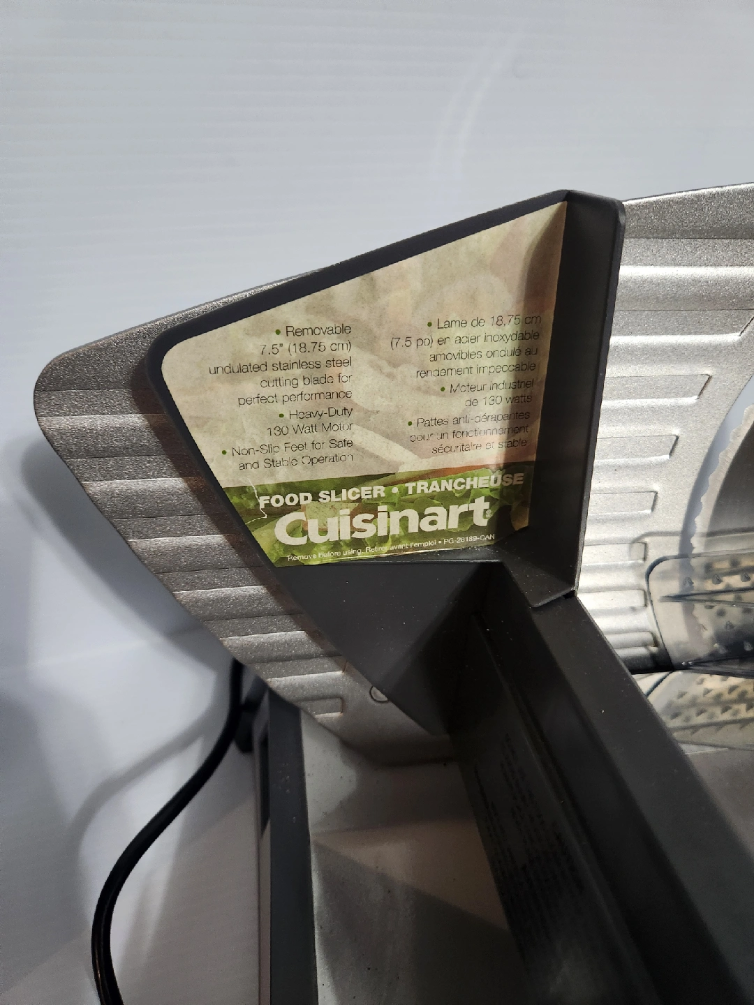 Selling a Cuisinart food slicer. It features a removable 7.5" (18.75 cm) undulated stainless steel cutting blade, perfect for precise performance. It's also heavy-duty with a 130-watt motor and non-slip feet for safe and stable operation
