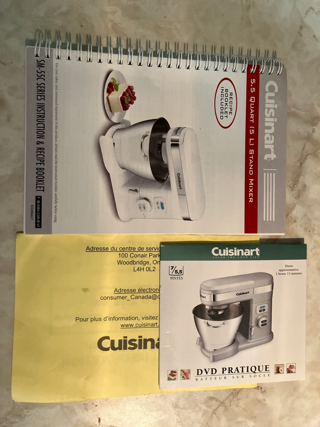 Selling a Cuisinart SM-55C series 5.5 quart stand mixer. It comes with the instruction and recipe booklet, and a DVD pratique. Rarely use almost new. come with all accessories including Beater Dough hook Mixer Cover