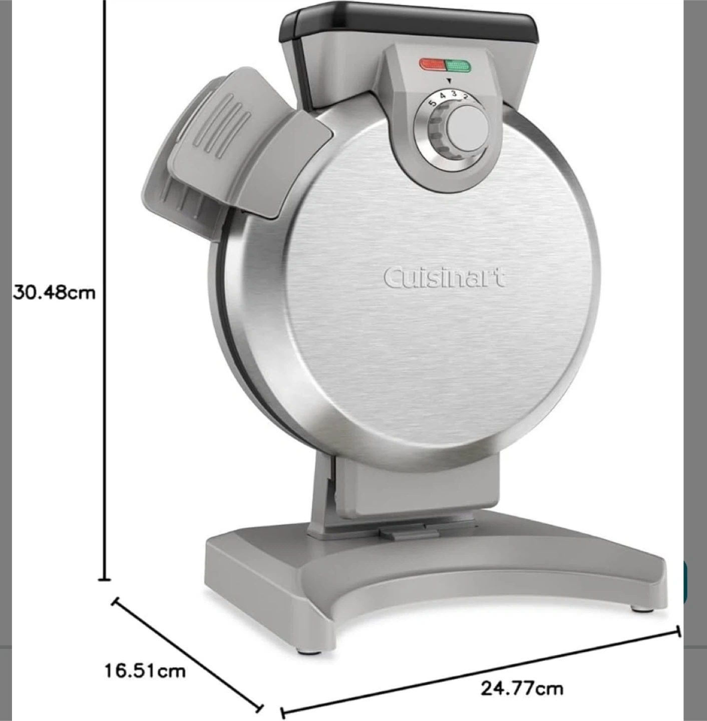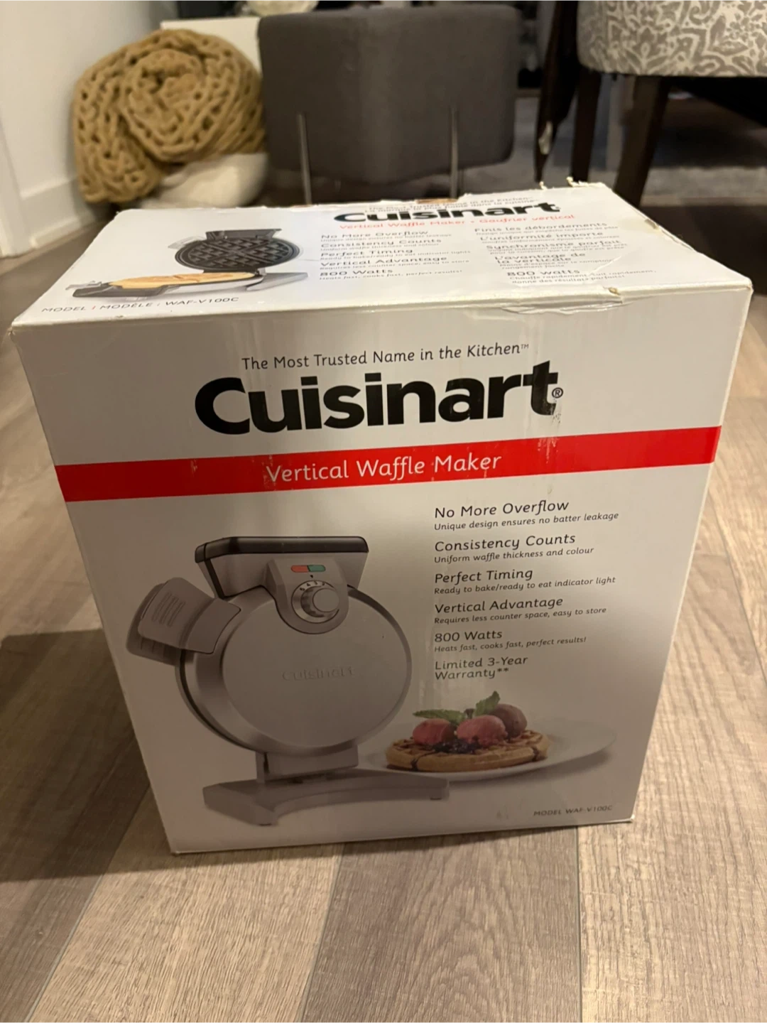 Cuisinart Vertical Waffle Maker model WAF-V100C It's in great shape and ready to make some delicious waffles. The unique vertical design ensures no overflow and less batter leakage. It also features consistency counts for uniform waffle browning and colour. The box is included.