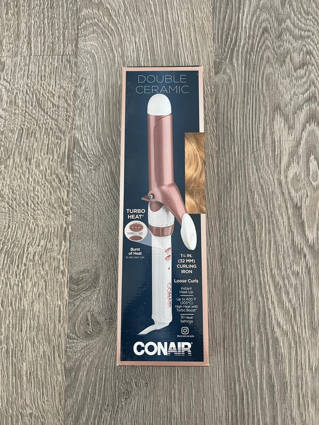 I'm selling a Conair Double Ceramic 1 1/4 inch (32mm) Curling Iron. It features turbo heat for instant results and multiple heat settings. It heats up to 400°F (205°C) with turbo heat. Perfect for creating loose curls!