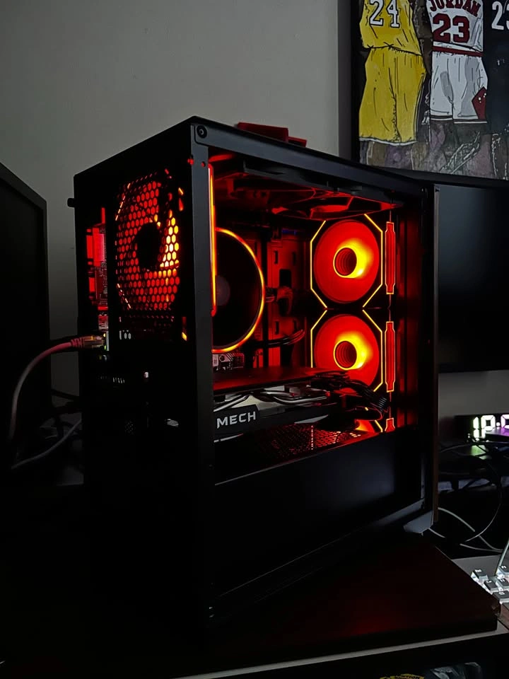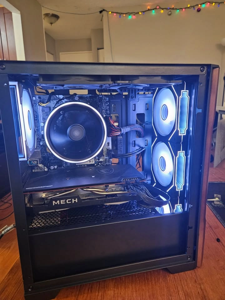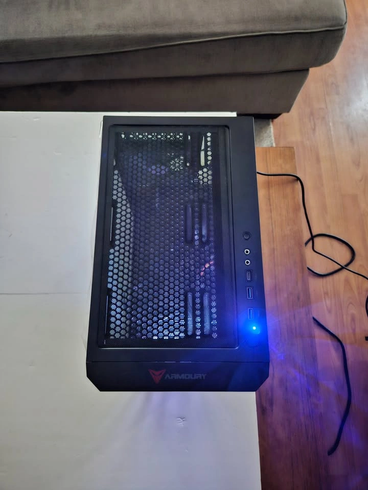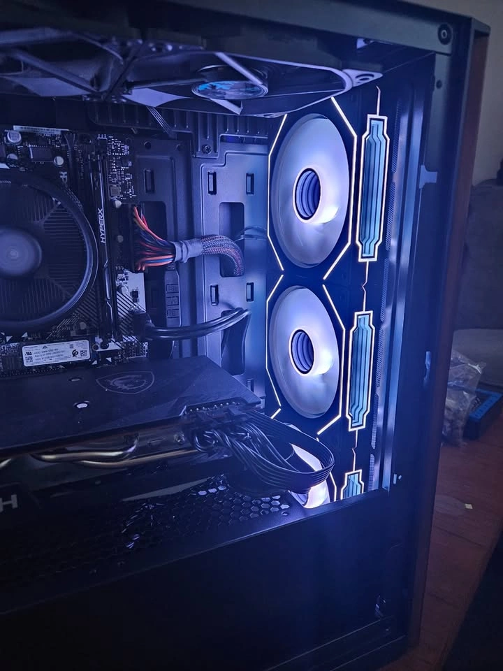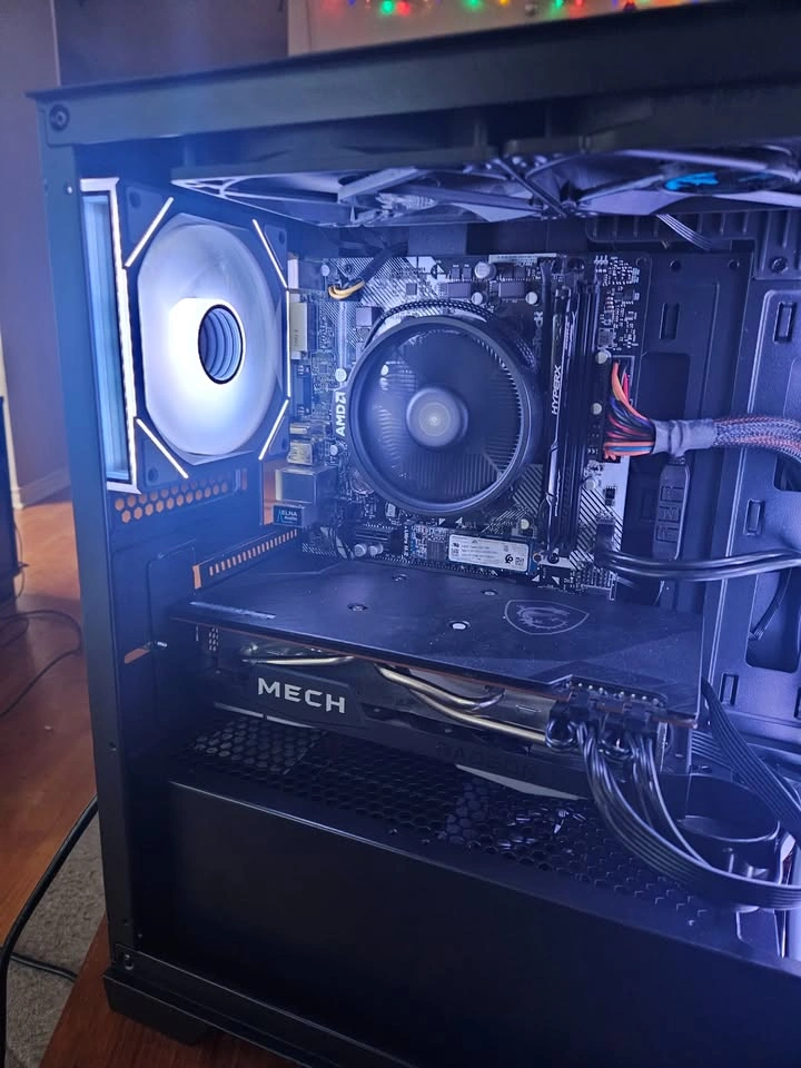 Minimalistic black gaming PC that runs all competitive titles in 1080p or 1440p at 120-240fps+ on pro settings. The extra VRAM allows for you to run games on high and ultra settings depending on the title. Below are all the components listed. If you have any questions feel free to reach out. Case: Brand new (Case Name). RGB Controller button shown in the video to control the RGB settings for the cooler and the case fans. Power Supply: 620W Semi-Modular (Comes with additional cables) RAM: 1 x 16gb black ram @ 2933 MHz CPU: (AM4) Ryzen 5 5600 @ 3.5 GHz up to 4.4 GHz , 6 Cores & 12 Threads. 32MB of L3 Cache. 512 GB NVME SSD PCIe Gen 3 x4 GPU: PNY RX 6700xt 12 GB of GDDR6. Supports FSR3 Frame gen. Motherboard: Asrock A320M-HDV Micro ATX. The PC will be delivered in the case box and I can leave the plastics on if you would like to peel them off yourself.