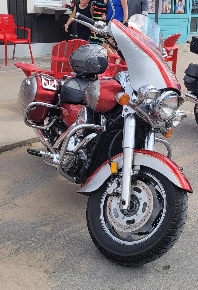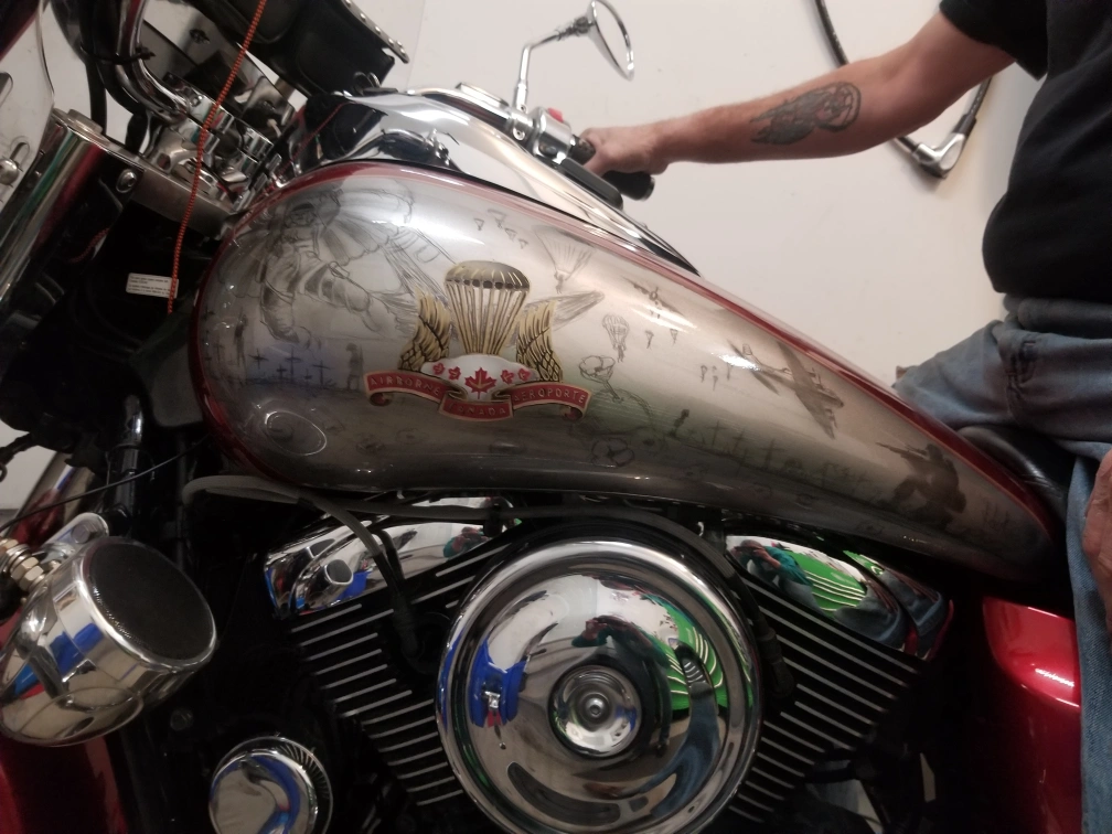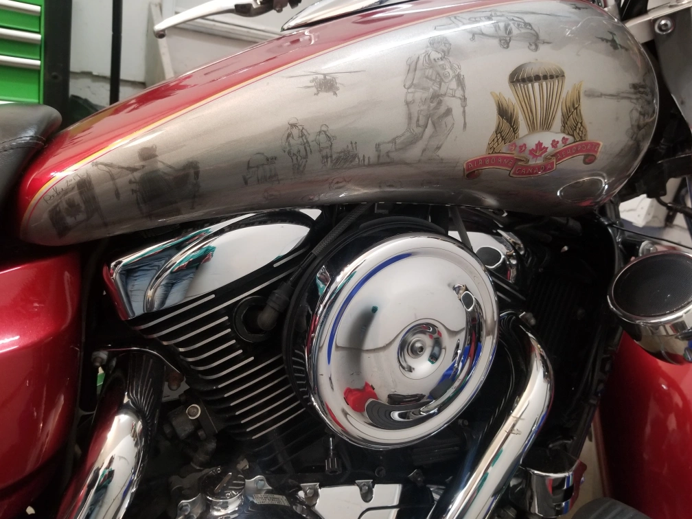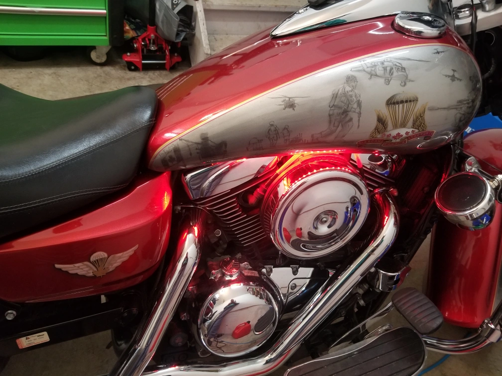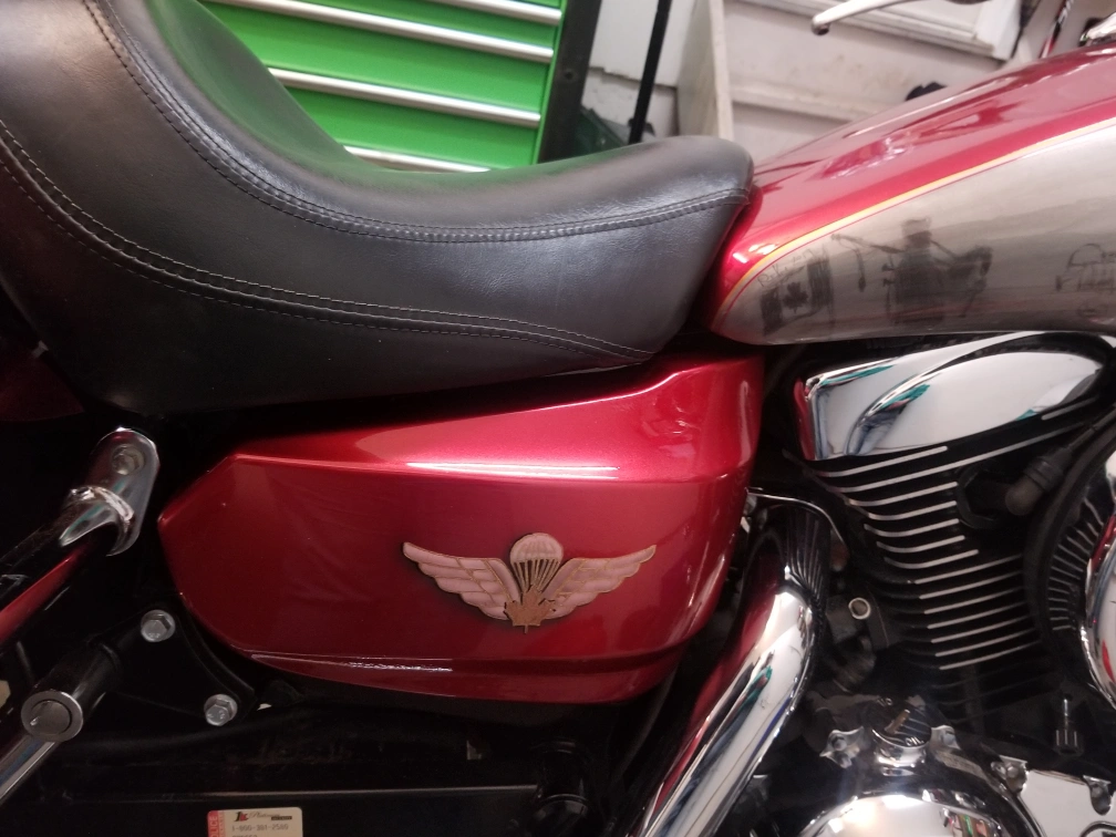 Selling a custom 2006 Kawasaki Vulcan Nomad 1600 motorcycle. It has a unique paint job with Airborne-themed artwork. The bike appears to be in good condition with chrome accents and a very comfortable seat: an Ultimate Seat. Perfect for cruising around town! Well loved. New engine 2023, new bearings, fork seals, new front tire with maybe 500kms on it. Please be respectful with offers, my husband can't ride it anymore, hand surgery that didn't recover as expected, and would rather see someone else ride it than let it collect dust.