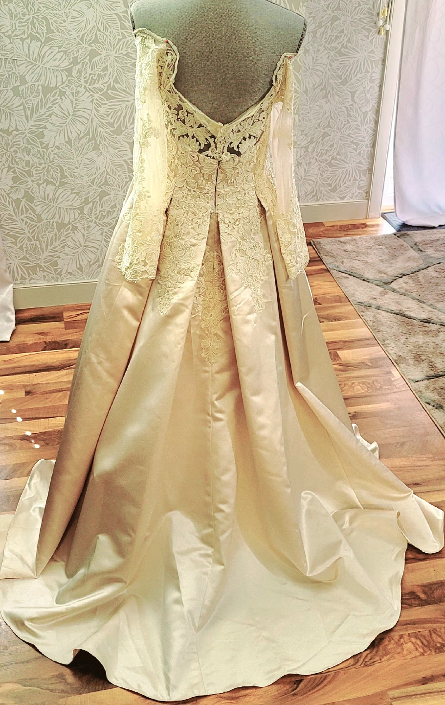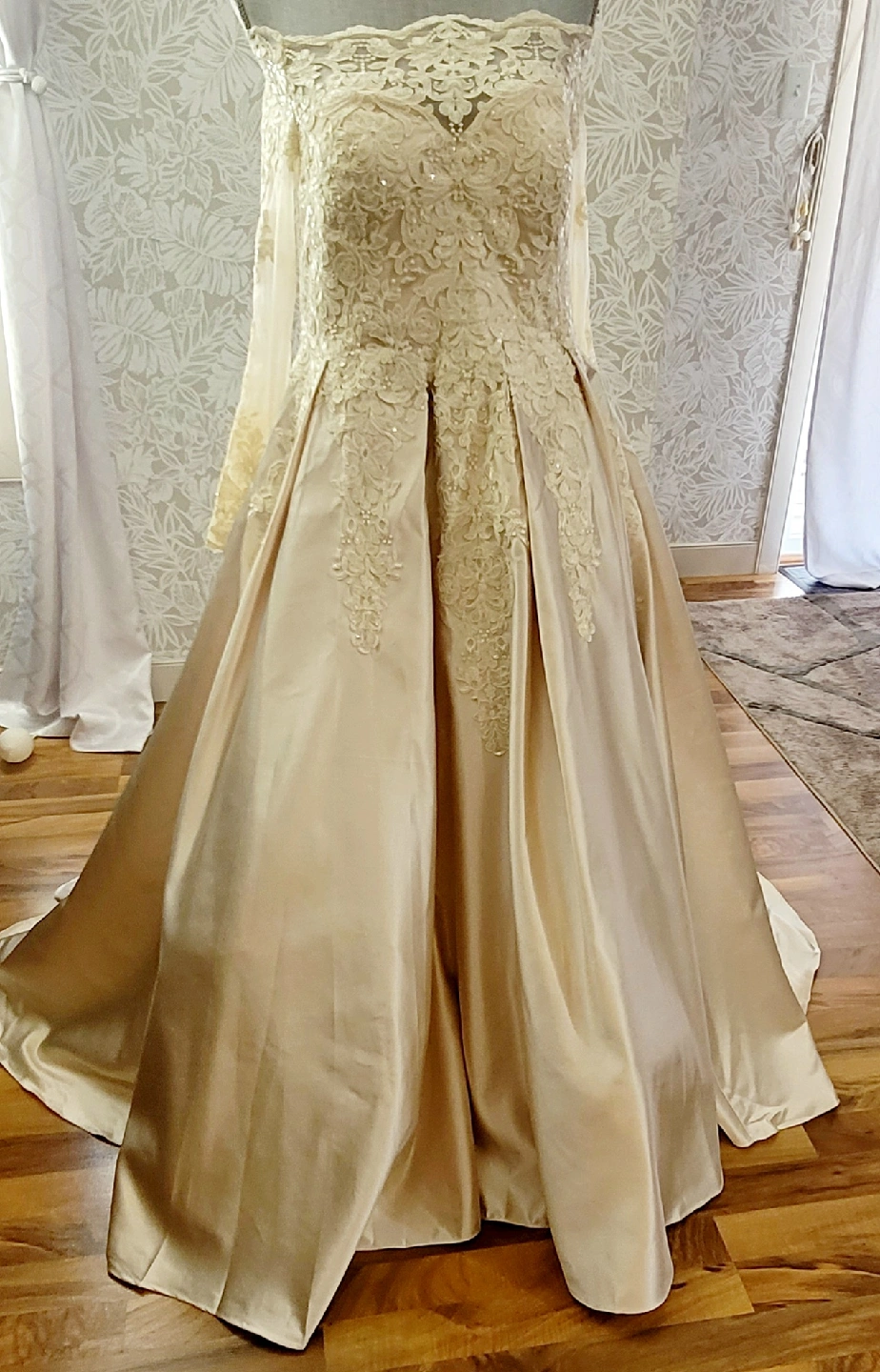 Selling a beautiful, Champagne colored off-the-shoulder ball gown/princess style prom dress. It features delicate lace detailing, sheer long sleeves with detailed sequins and a fitted bodice that is covered with laces and satin fabric skirt with a little bit of sweep train at the back. Combination of zipper and buttons closure in the back. Full details and original photos from the website with the detailed custom measurements are added in the photos. Purchased for $350 together with the dress garment bags. Located in Sherwood Park.Was supposed to be used for a wedding but went for a different style. Measurements: Hips: 41" Bist: 35" Waist: 33" I usually wear medium-large or 8-10 sized dress. *If the ad is up it is still available*