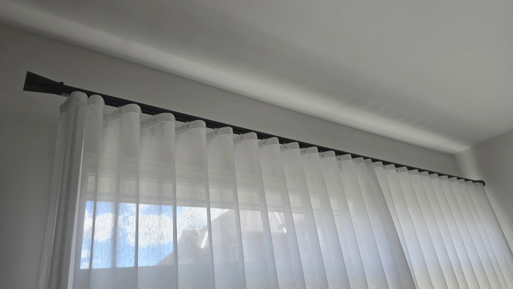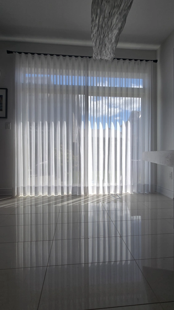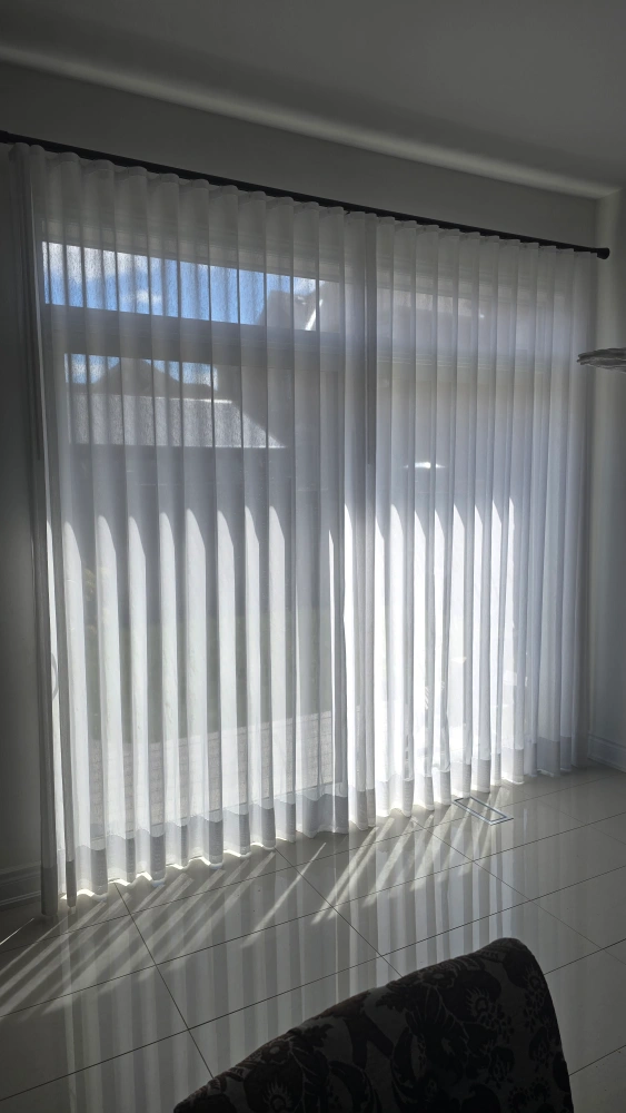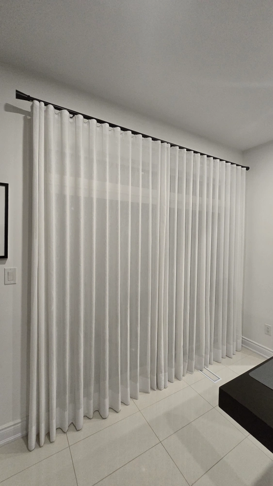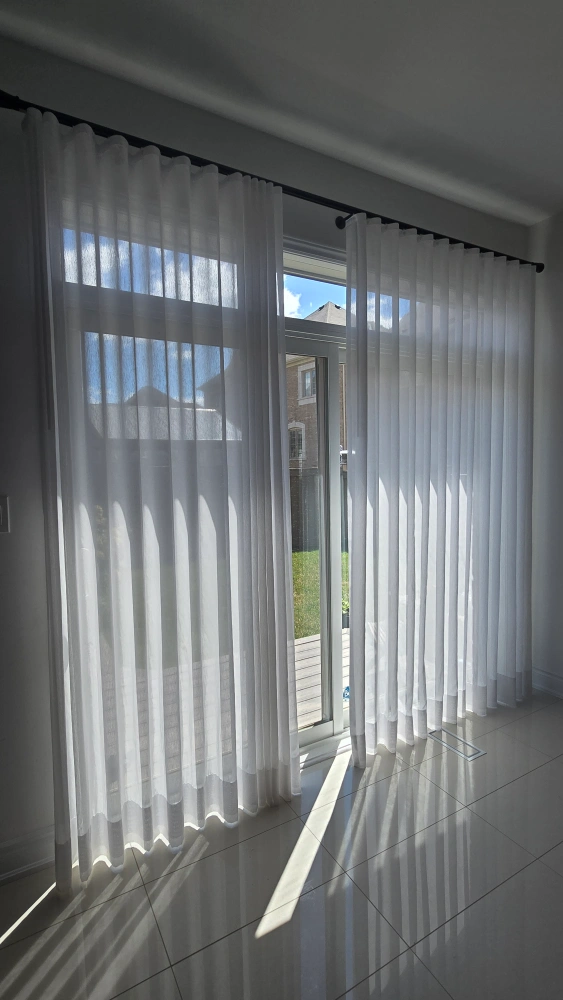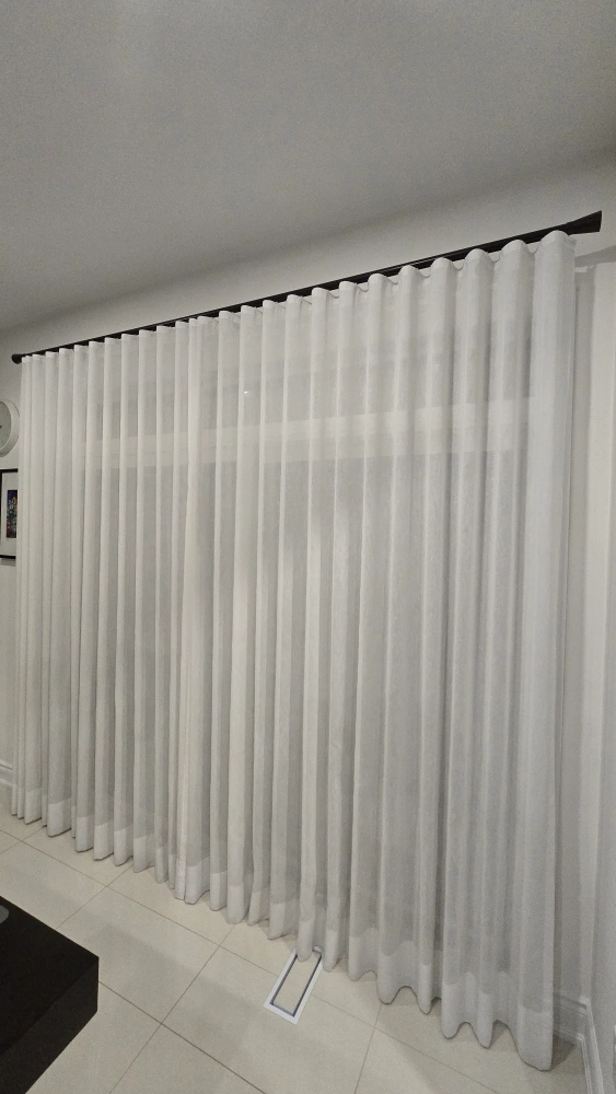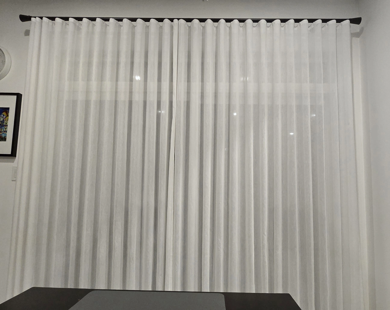 Custom, ripple-fold sheer curtains - white and hardware (curtain-rod and finials). Excellent condition - no rips/stains Curtains move with ease from side to side Let in just the right amount of light while providing privacy. curtain height: 96" curtain width: designed to fit 96" opening curtain rod and finials: about 100" long (dark brown/bronze)